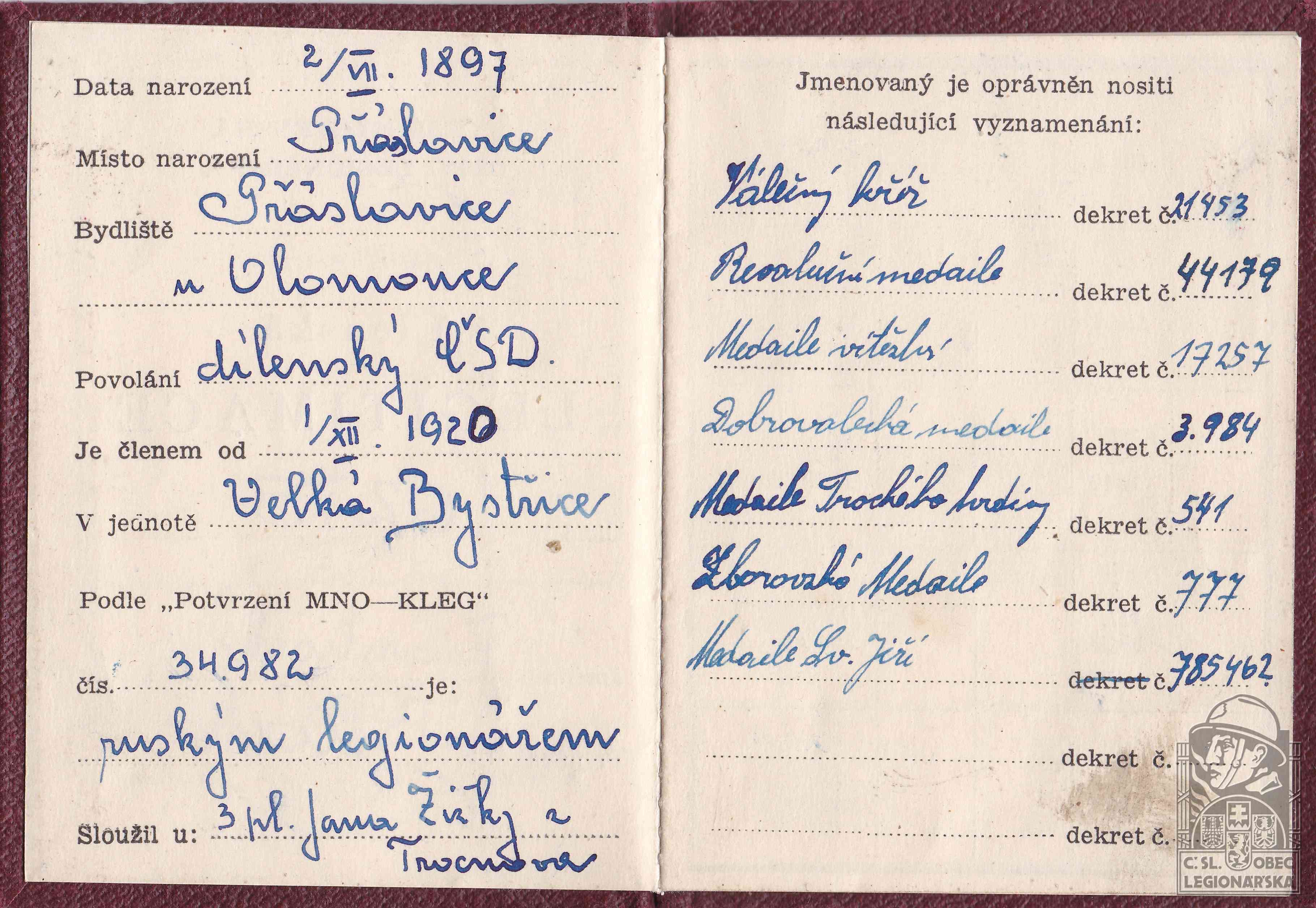 Zdroj informací: legionářský poslužný spis osobní karta legionáře