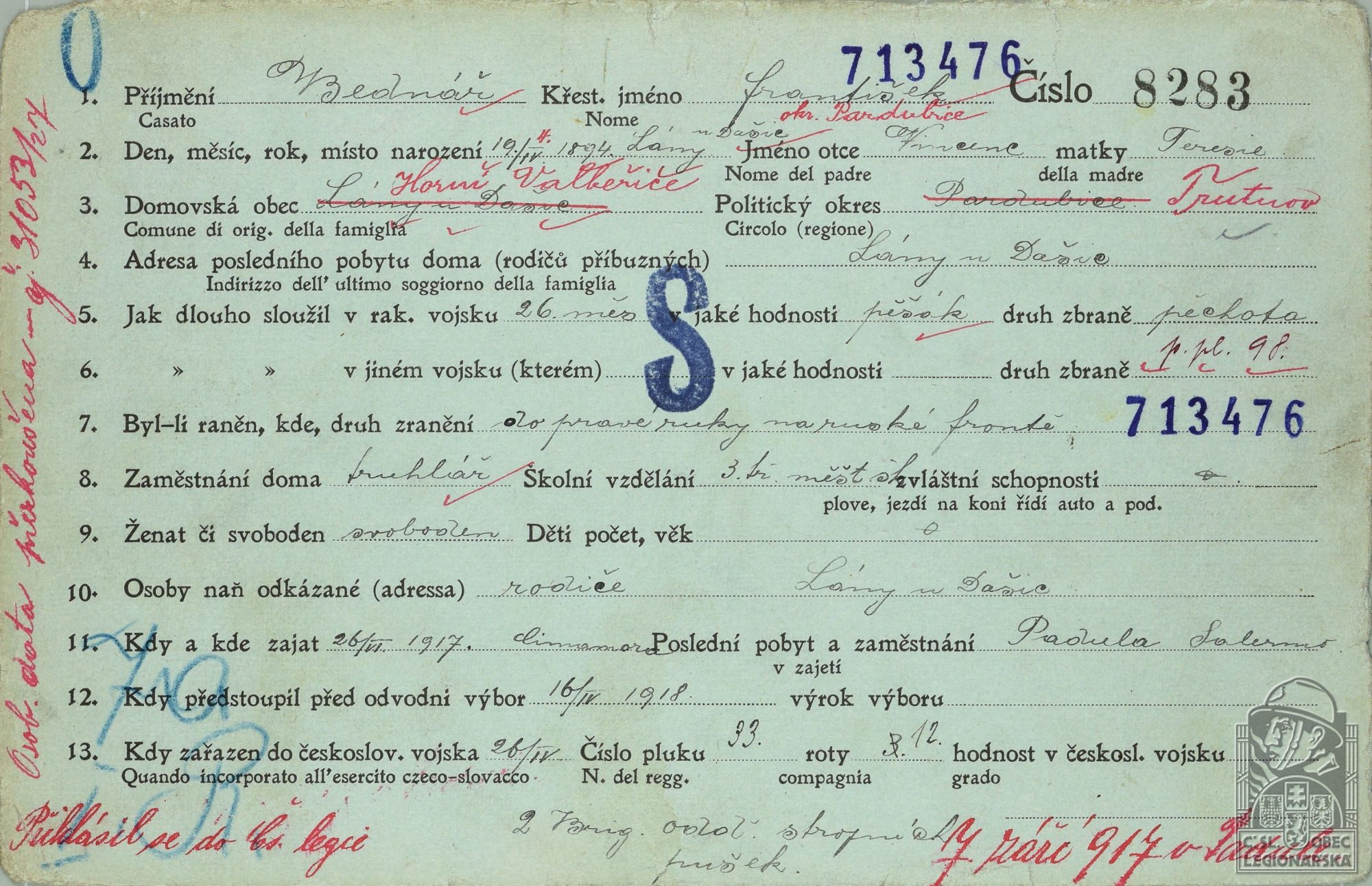 Jednotka v době zařazení:34.p.pl. ( Čs. legie v Itálii )