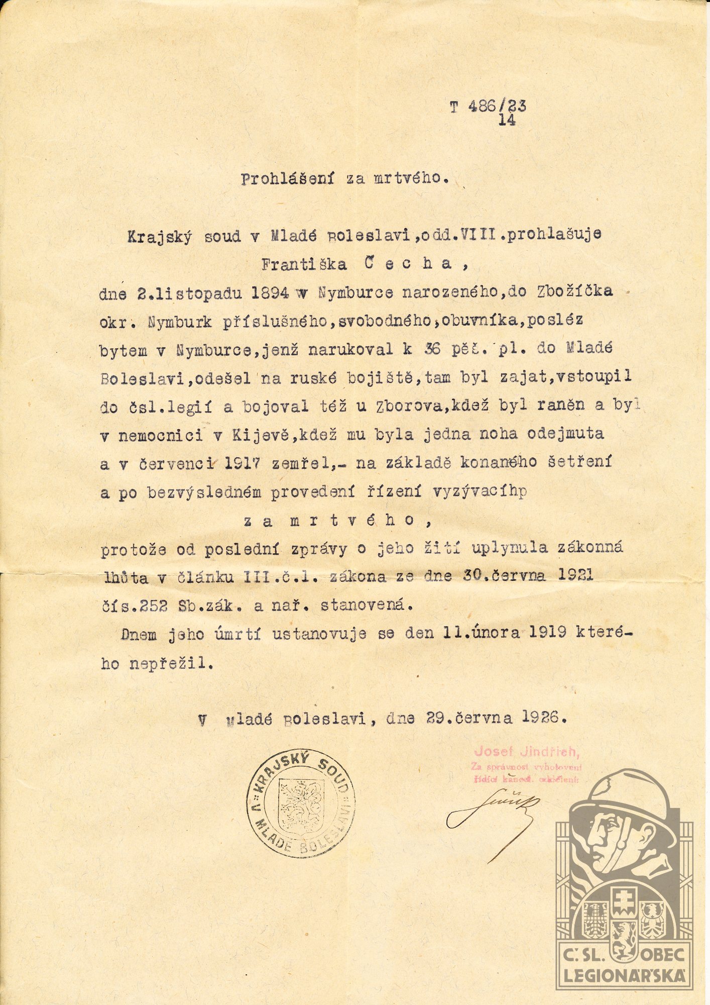 Konec v legiích:19.8.1917 ( Zemřel na následky zranění )