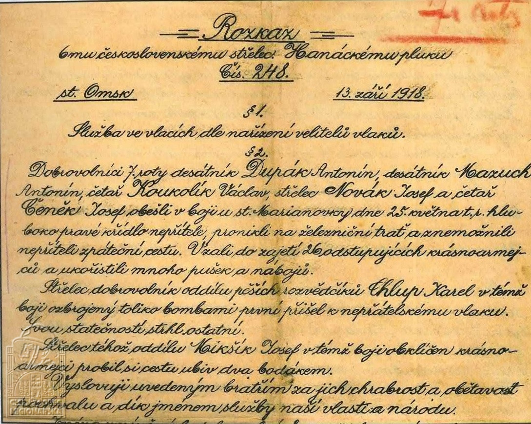 Jednotka v době zařazení:6.stř.pl. ( Čs. legie v Rusku )