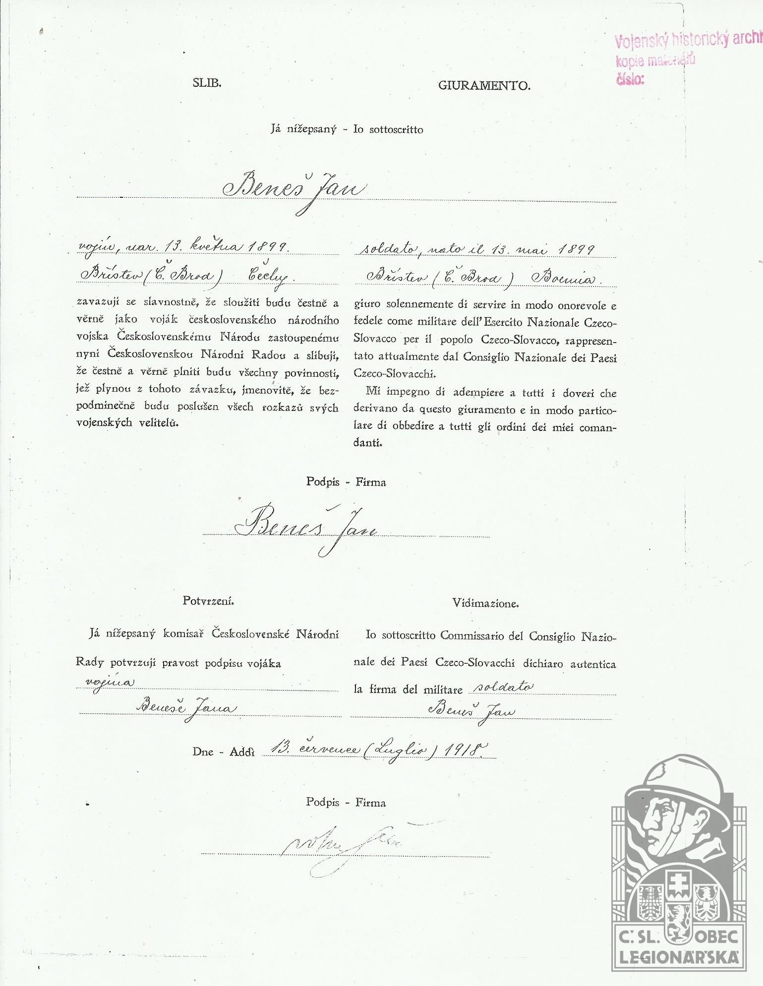 Datum zařazení do legií:13.7.1918