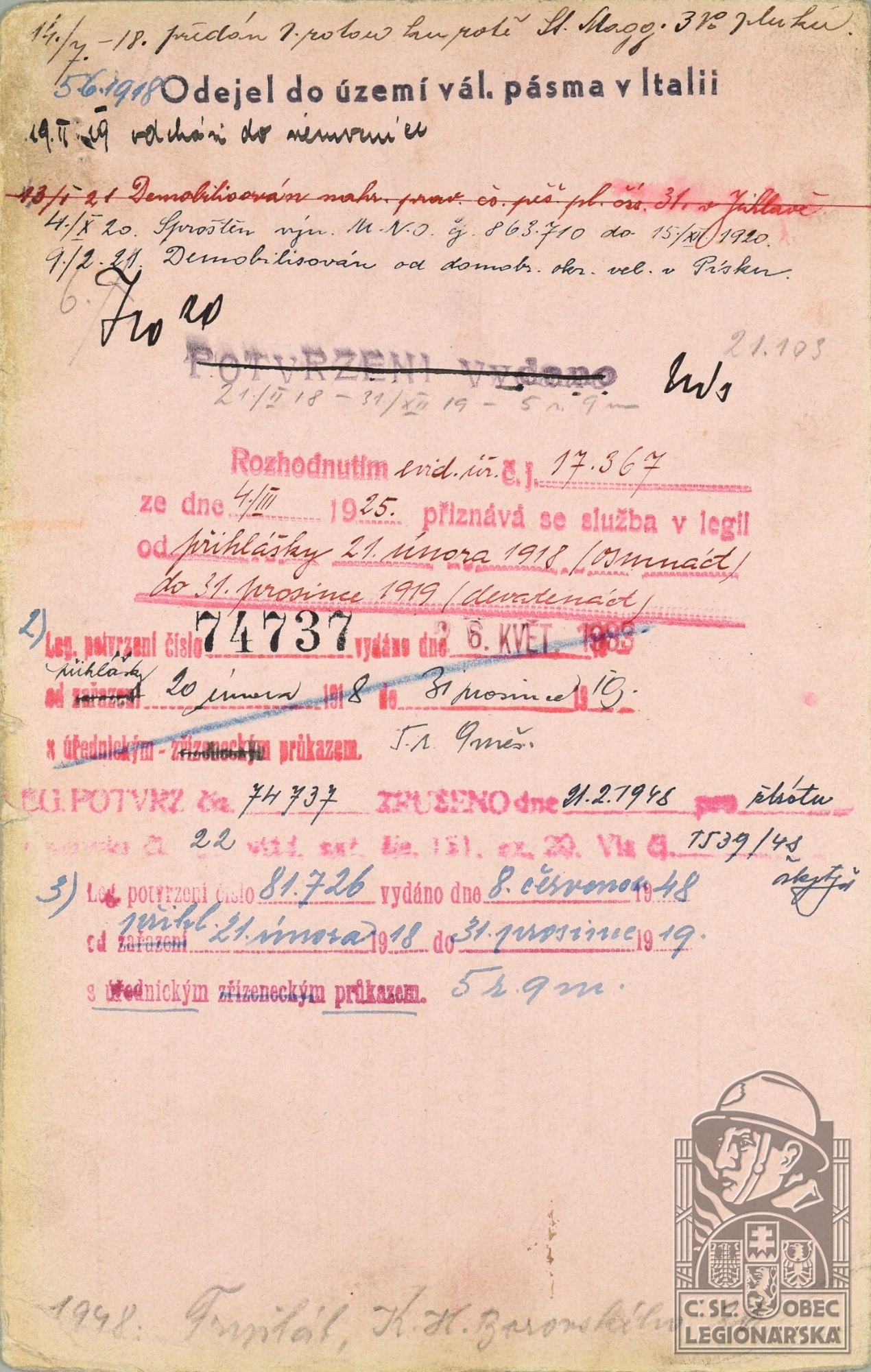 Konec v legiích:13.1.1921 ( Demobilizován )