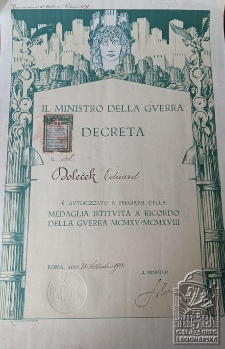 Jednotka v době zařazení:34.p.pl. ( Čs. legie v Itálii )