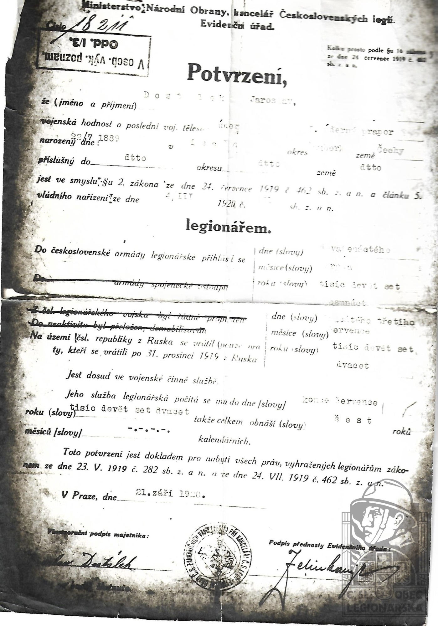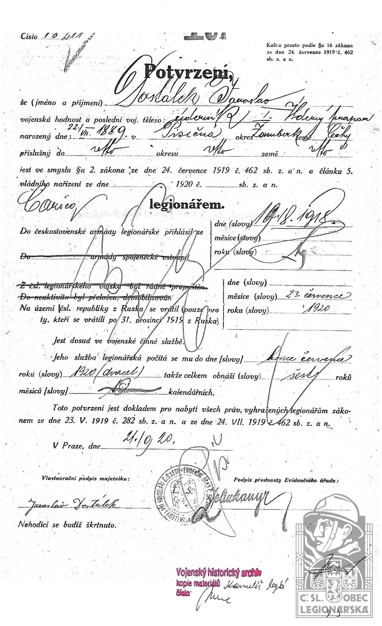 Datum podání přihlášky do legií:19.8.1918