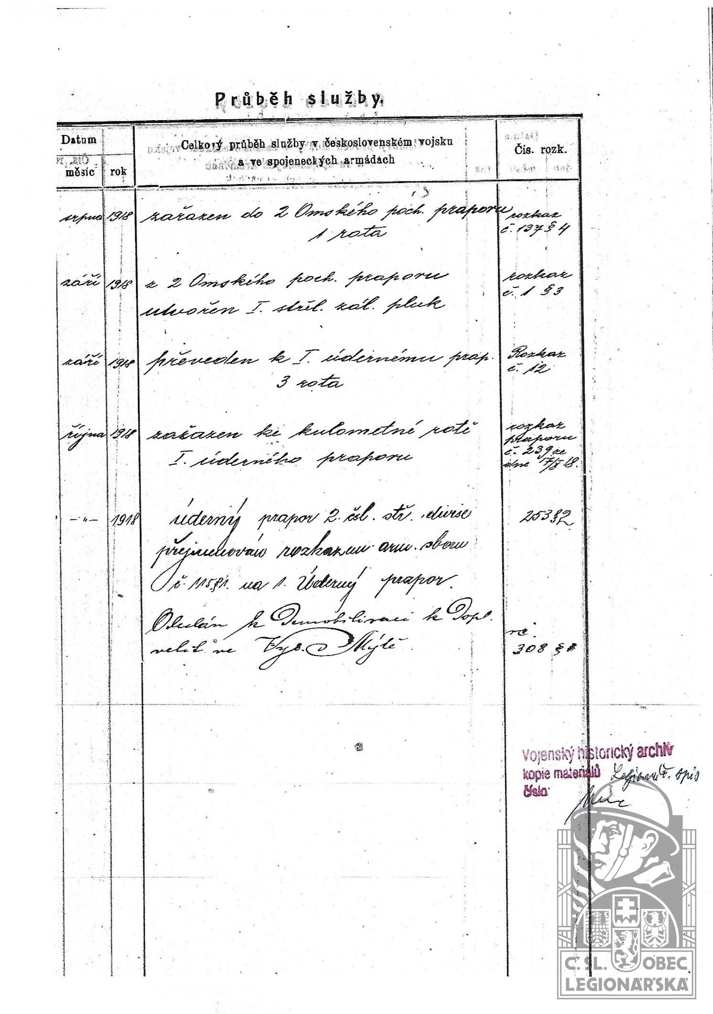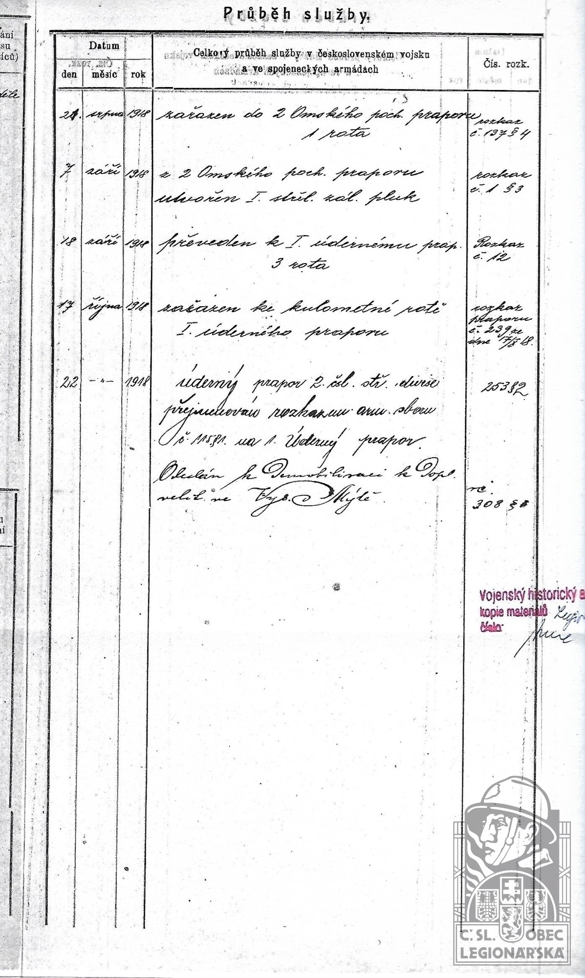 Datum zařazení do legií:21.8.1918