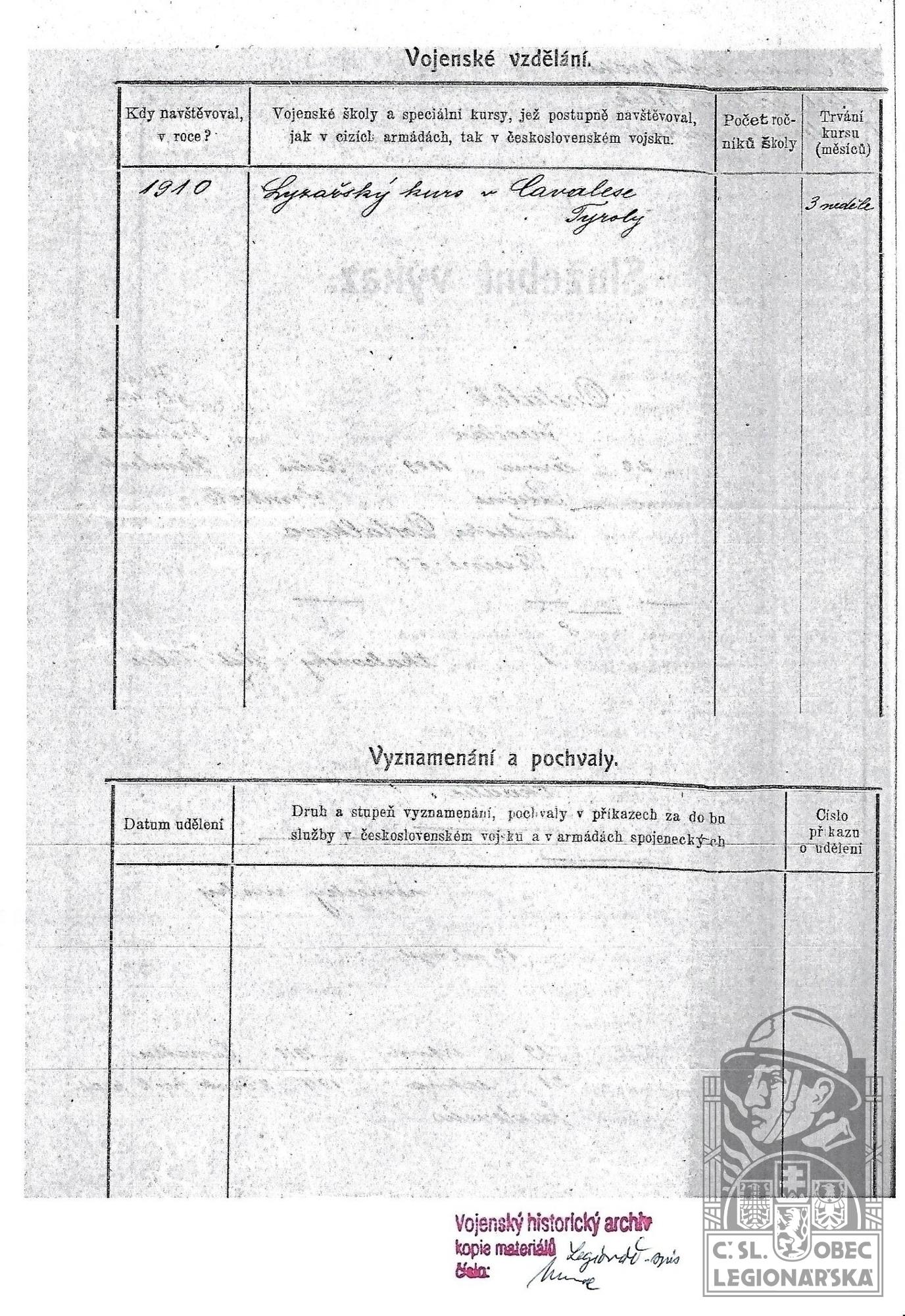 Zdroj informací: legionářský poslužný spis osobní karta legionáře