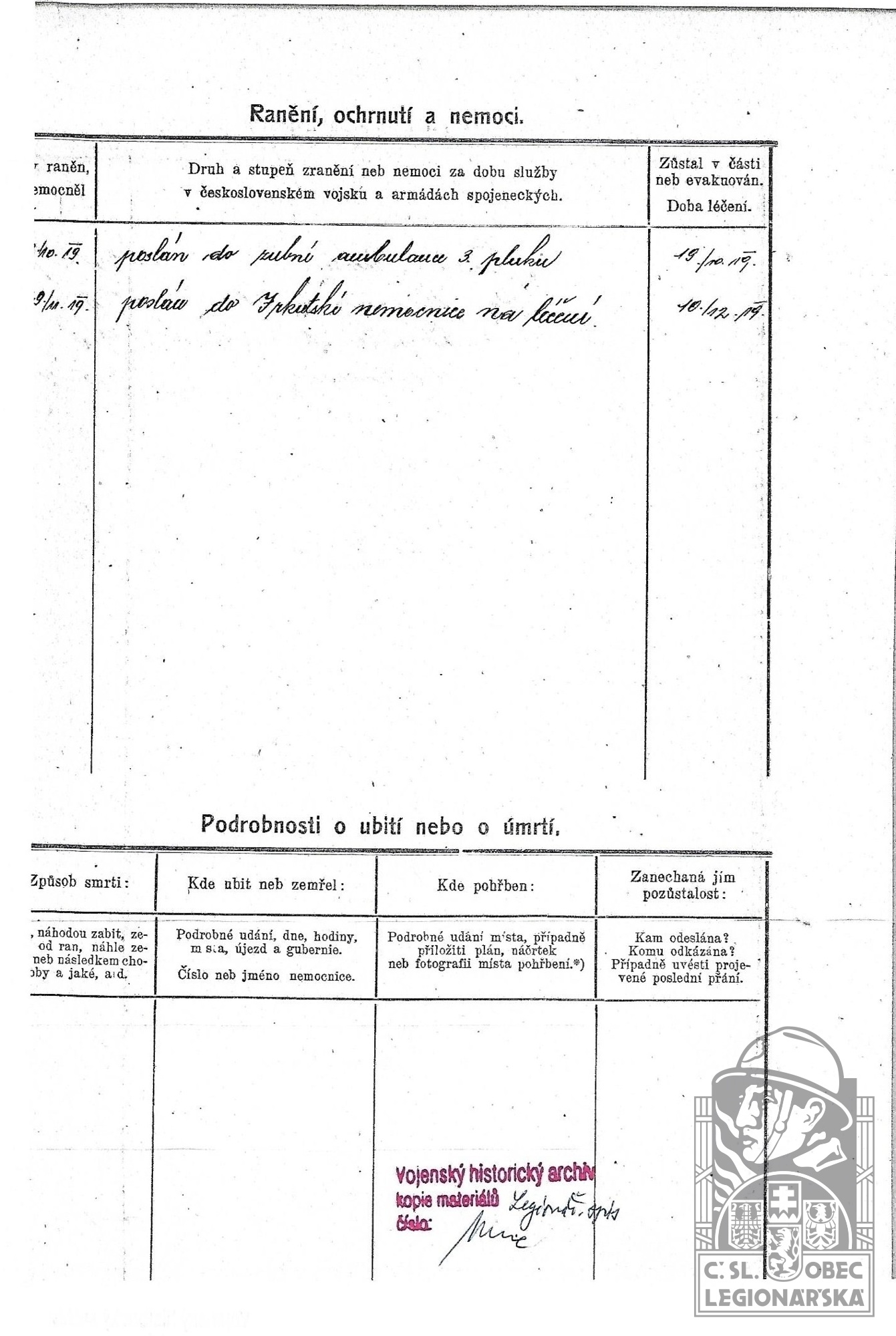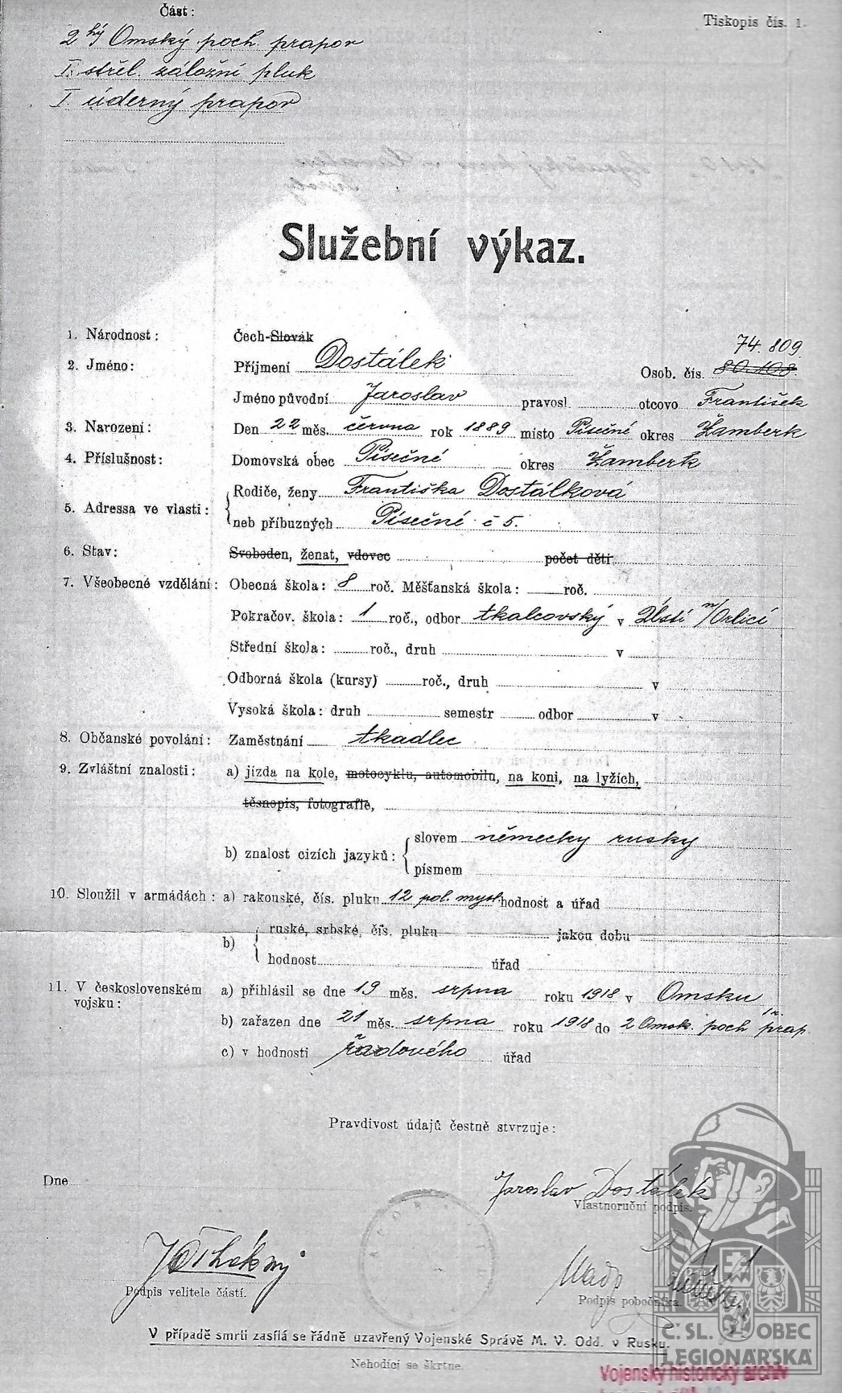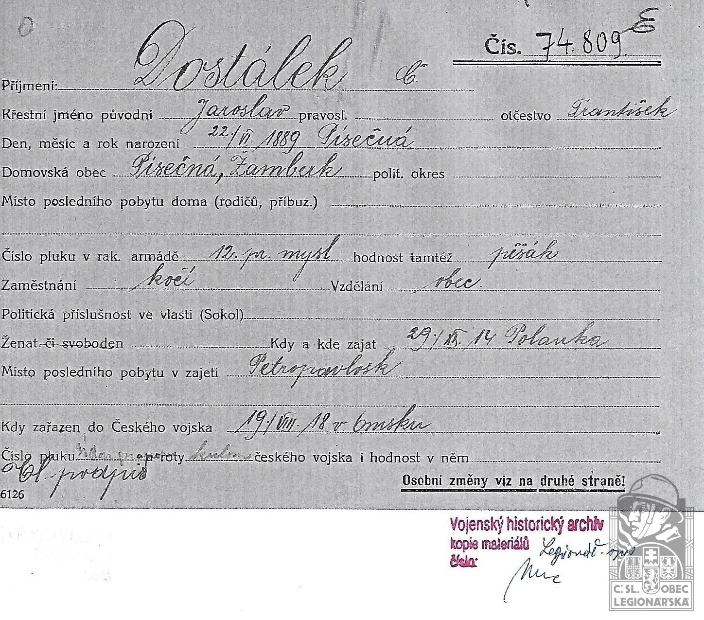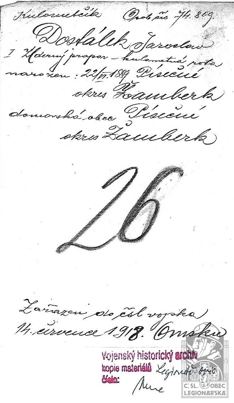 Jednotka v době zařazení:2.oms.poch.pr. ( Čs. legie v Rusku )