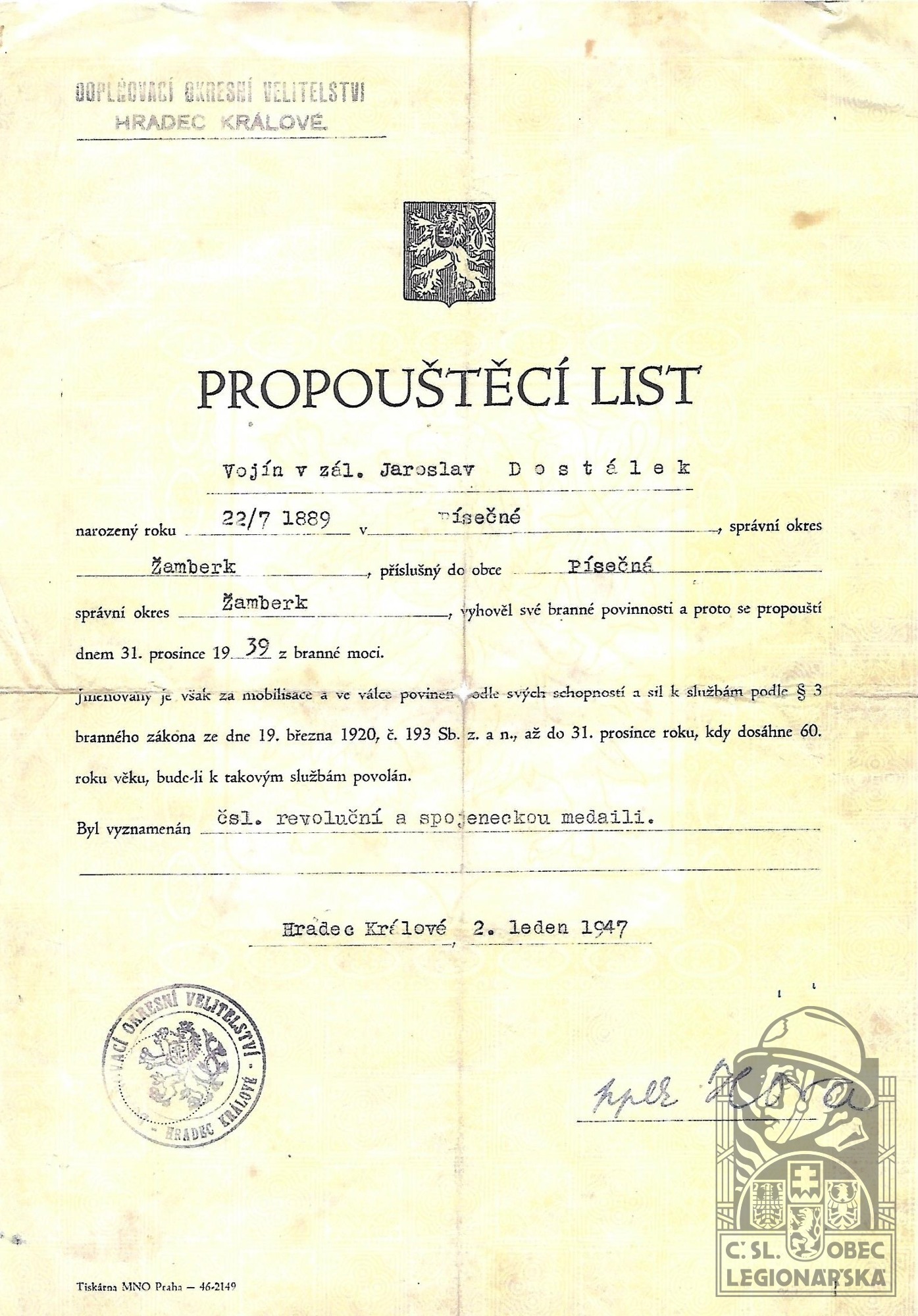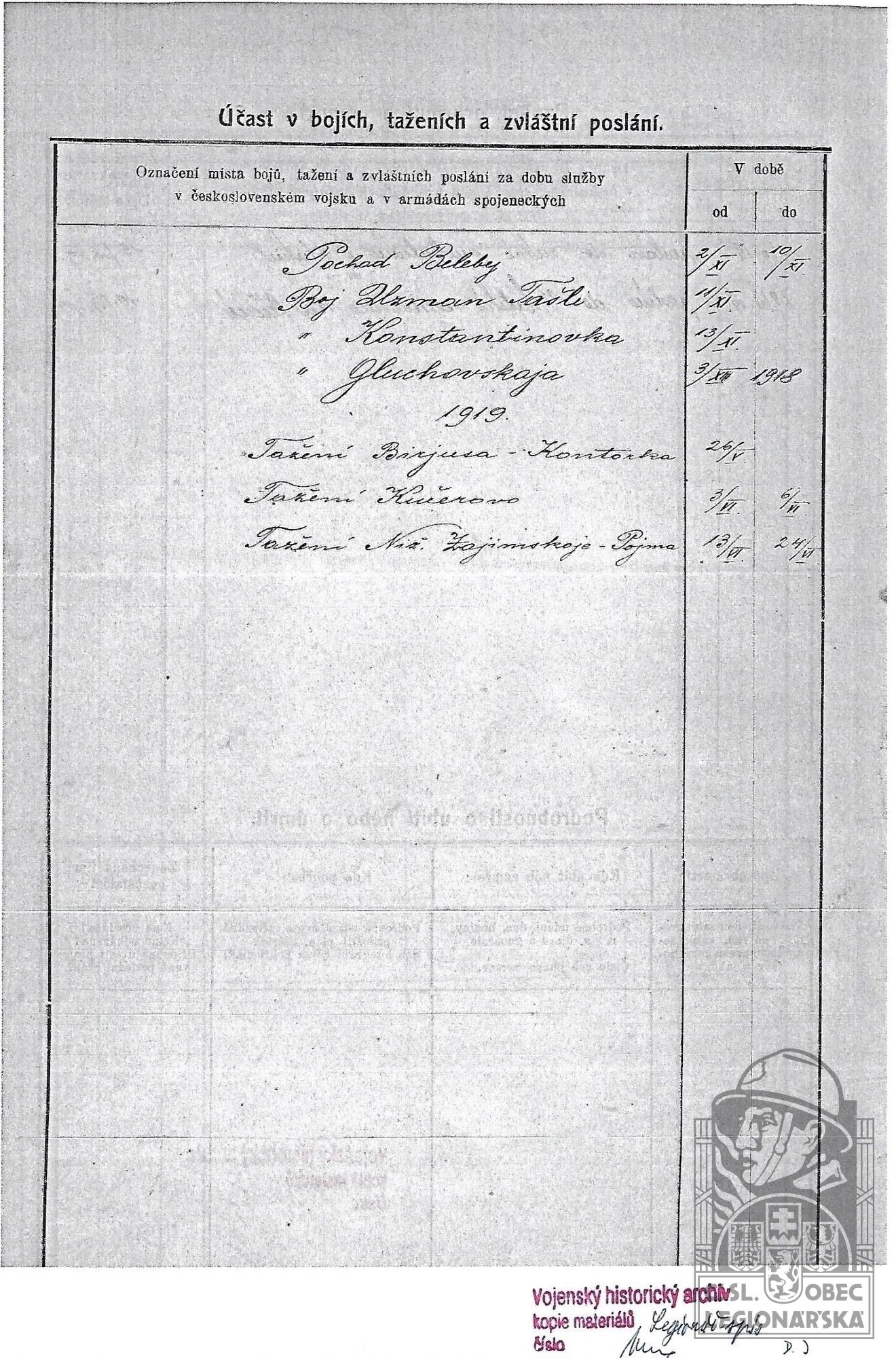 dokumenty spojené s osobou legionáře