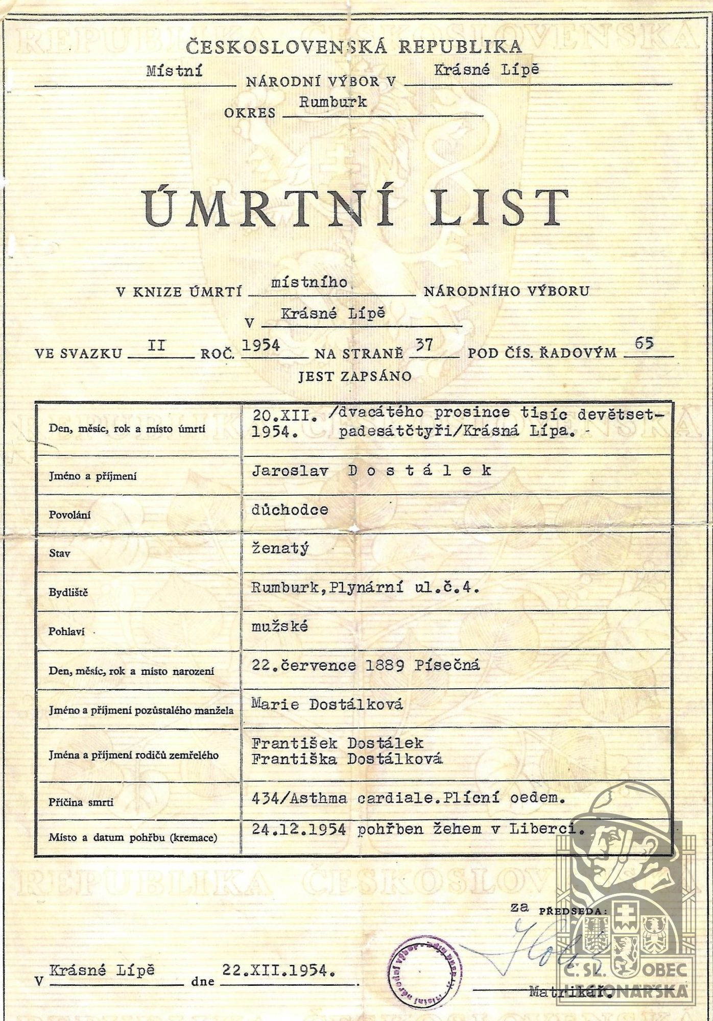 Legionář Jaroslav Dostálek zemřel 20. 12. 1954 v Krásné Lípě, kde má být po zpopelnění údajně také pochován.