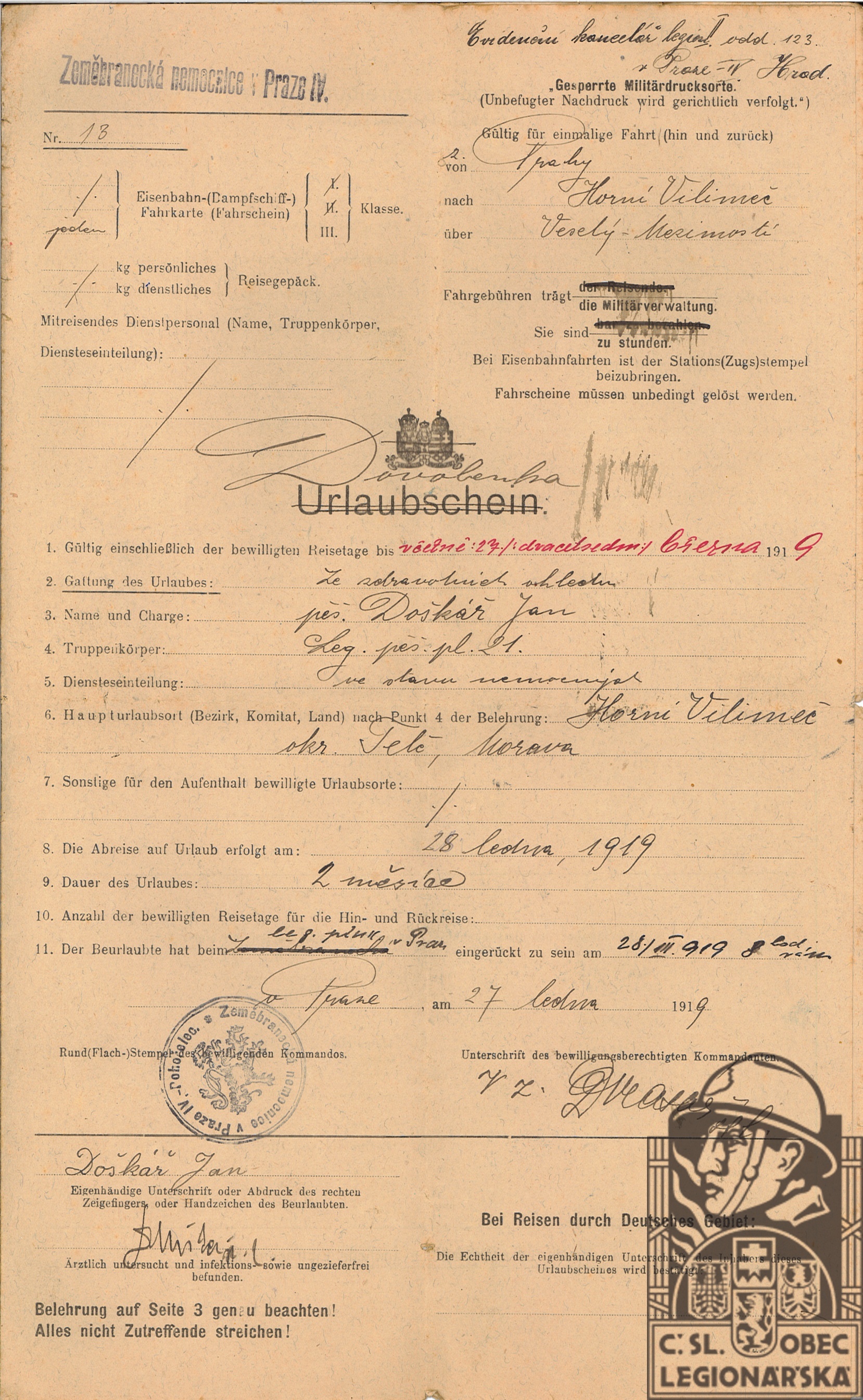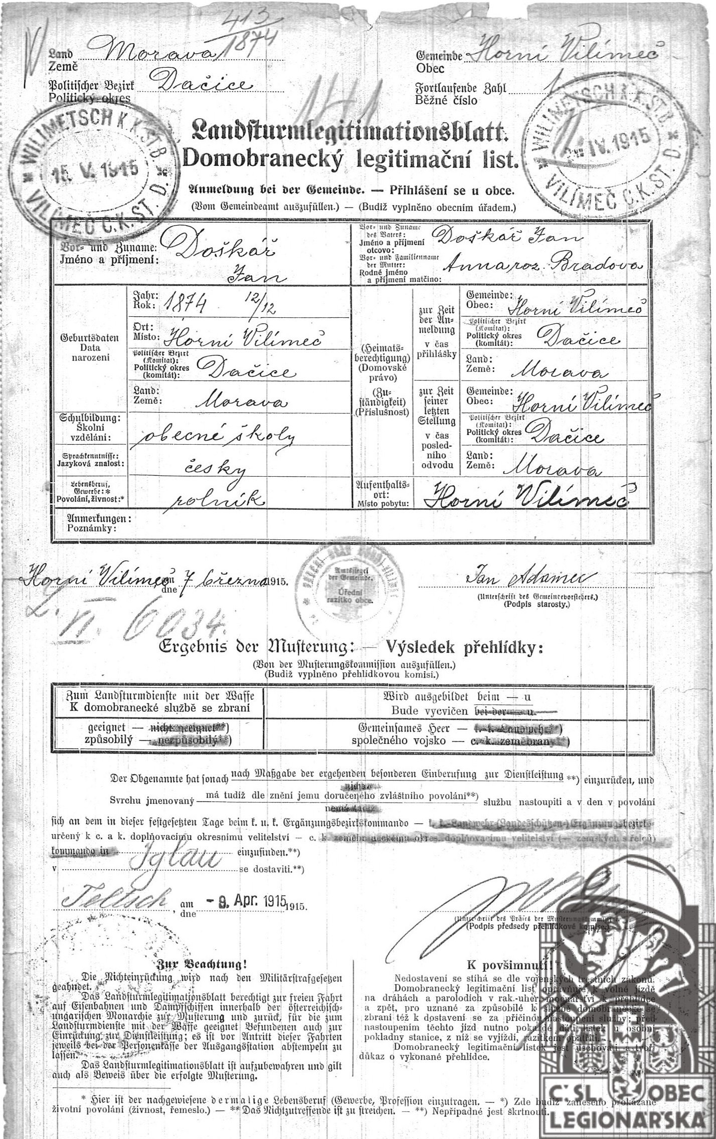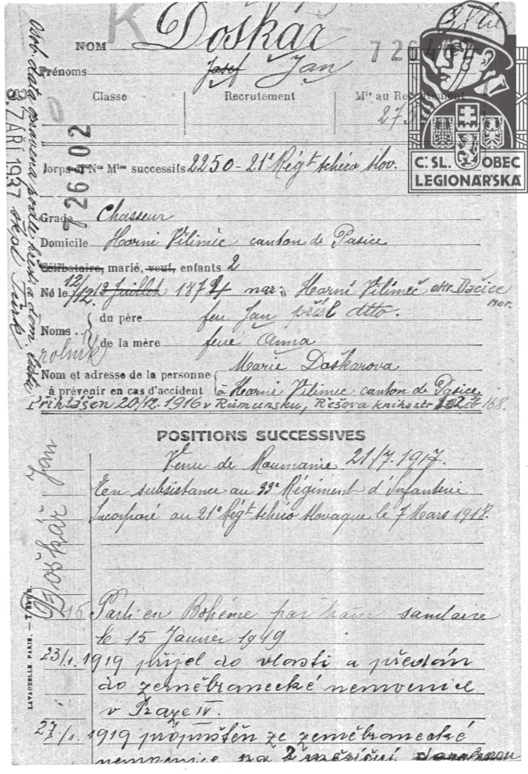 Zdroj informací: legionářský poslužný spis osobní karta legionáře