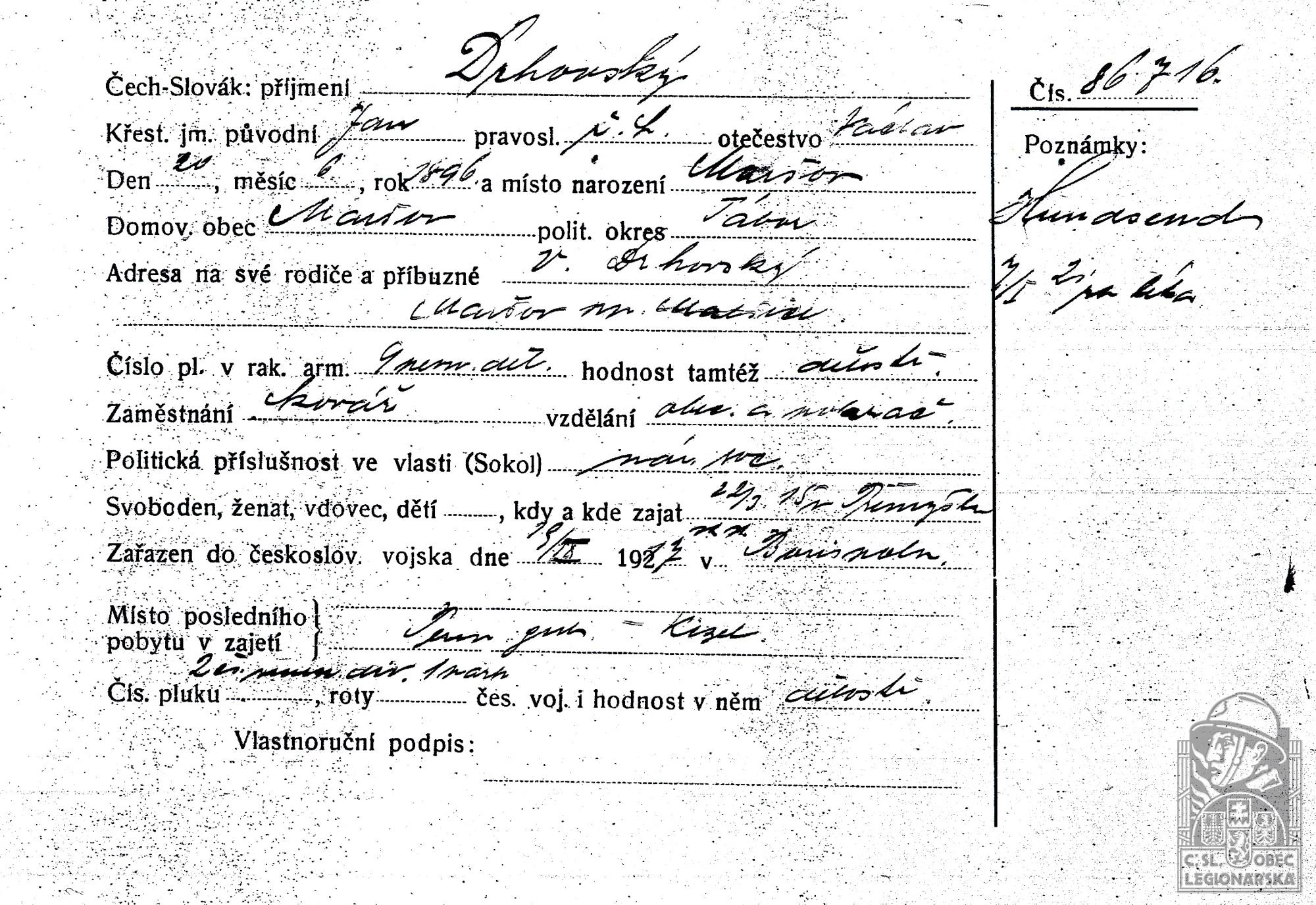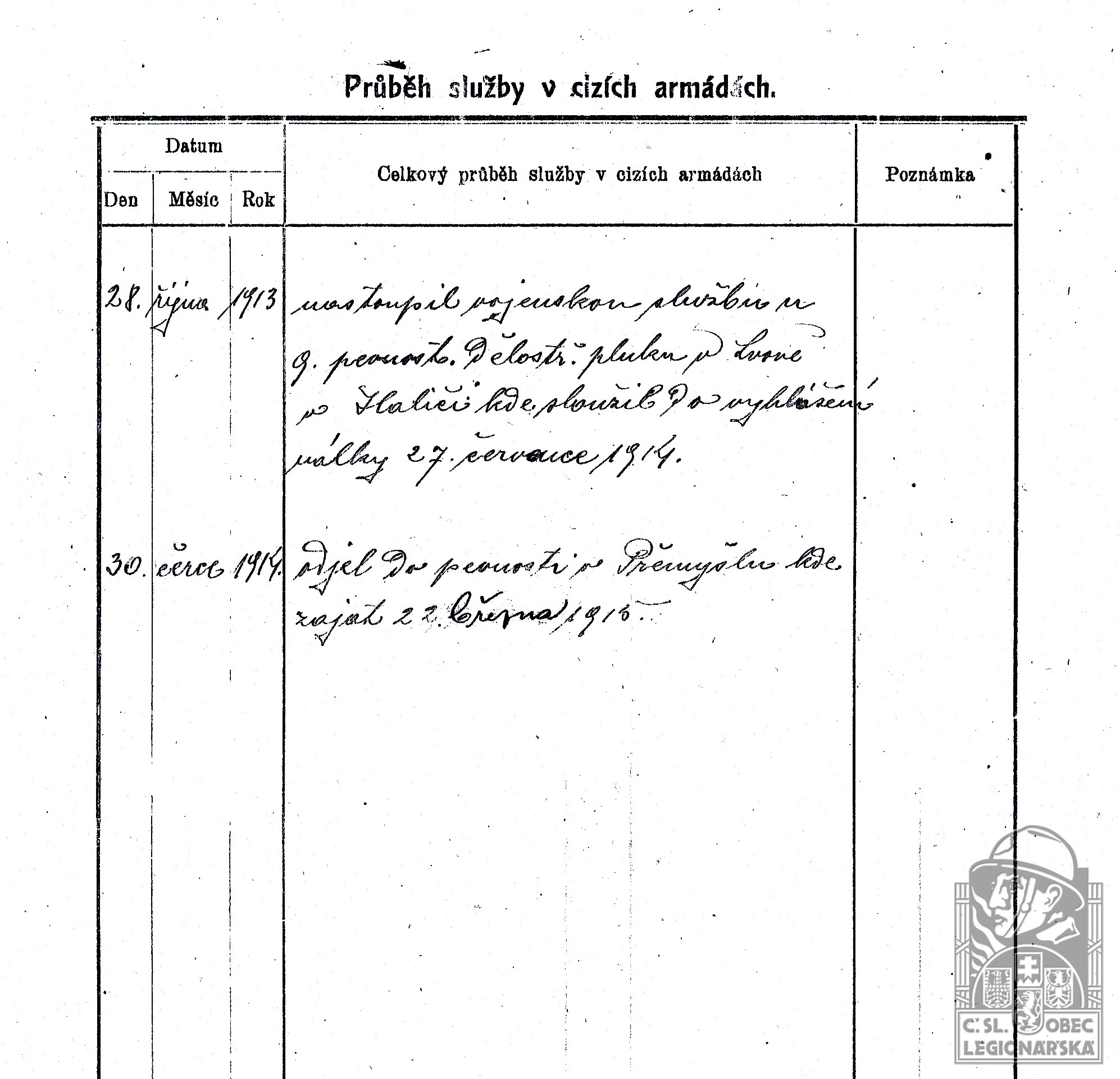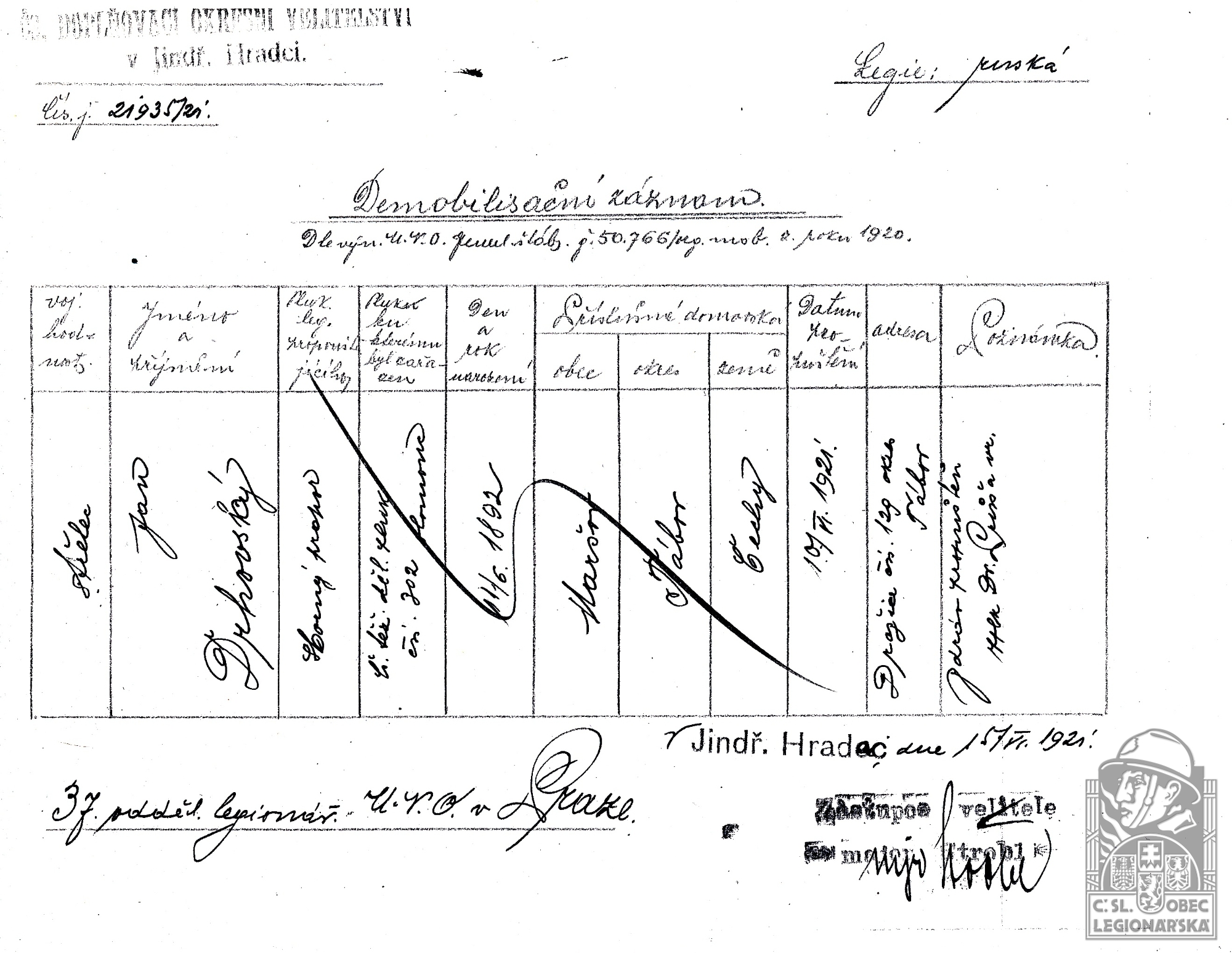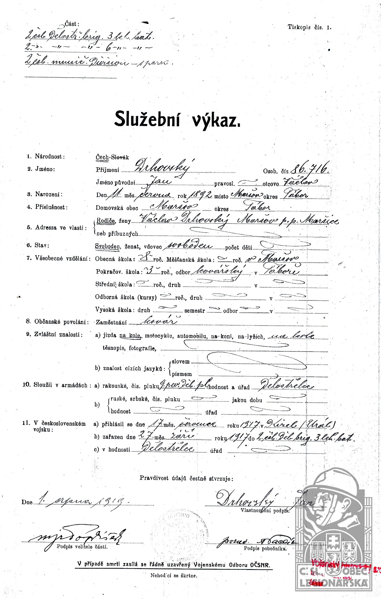 Zdroj informací: legionářský poslužný spis osobní karta legionáře