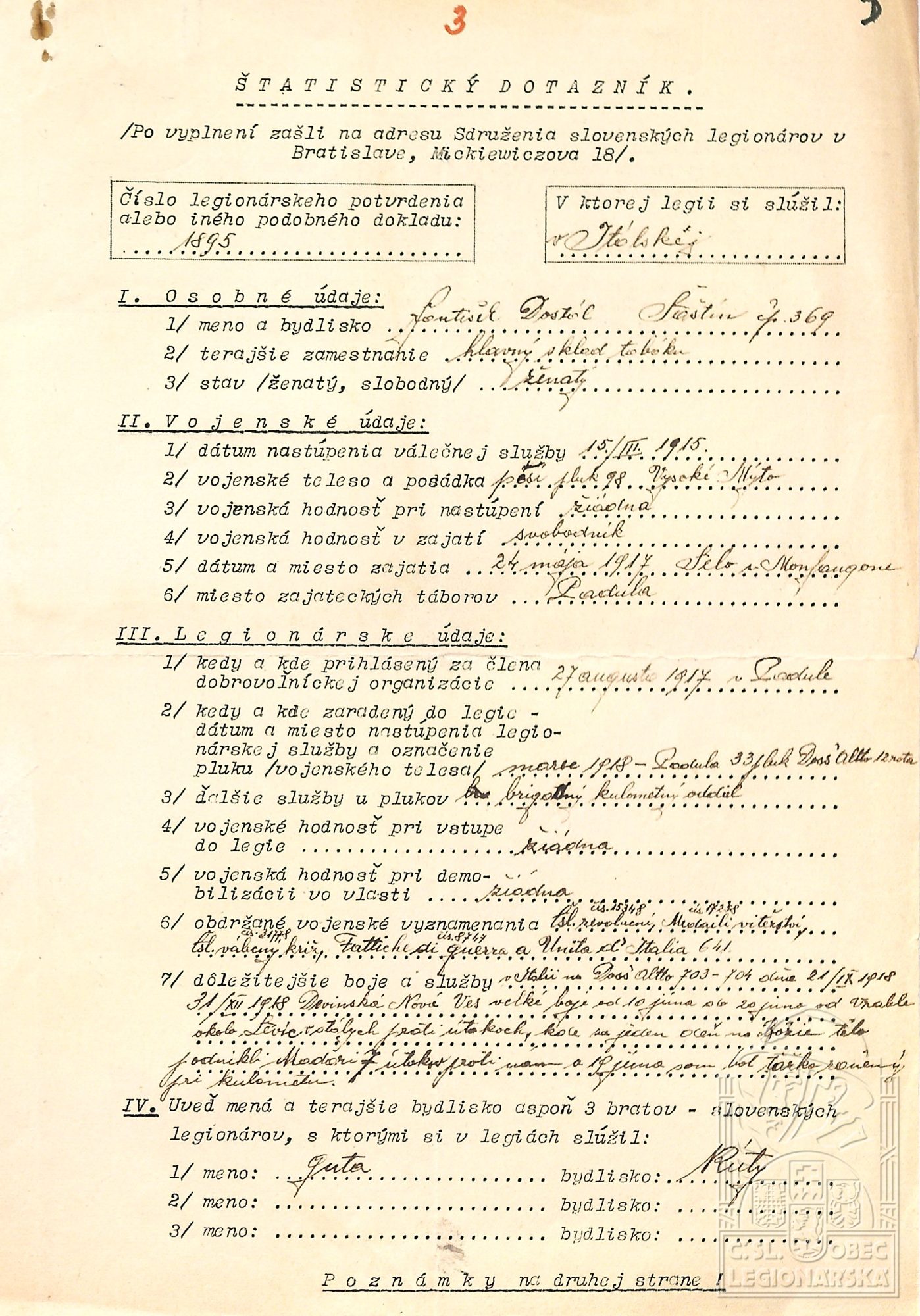Jednotka v době zařazení:33.p.pl. ( Čs. legie v Itálii )