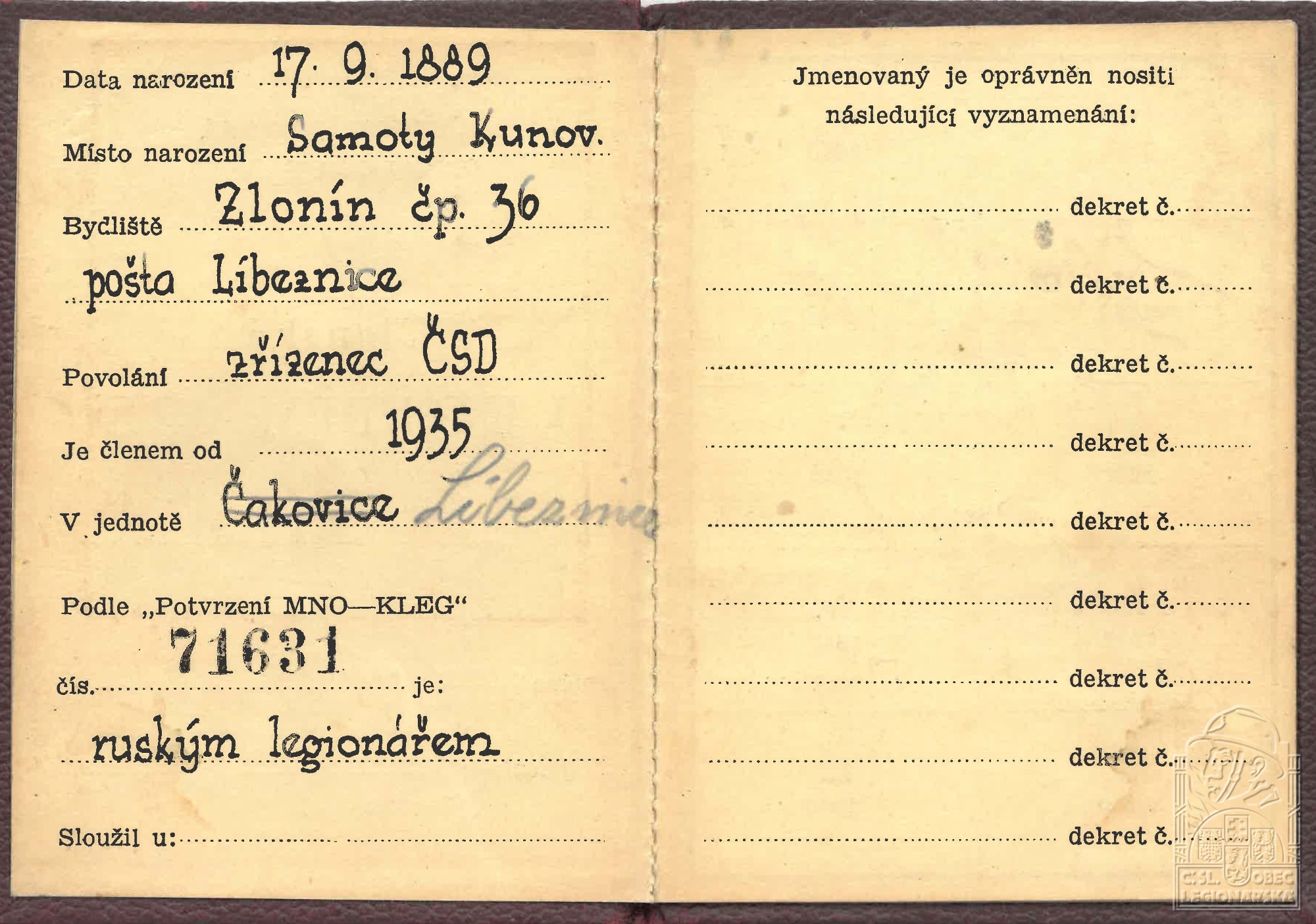 Zdroj informací: legionářský poslužný spis osobní karta legionáře