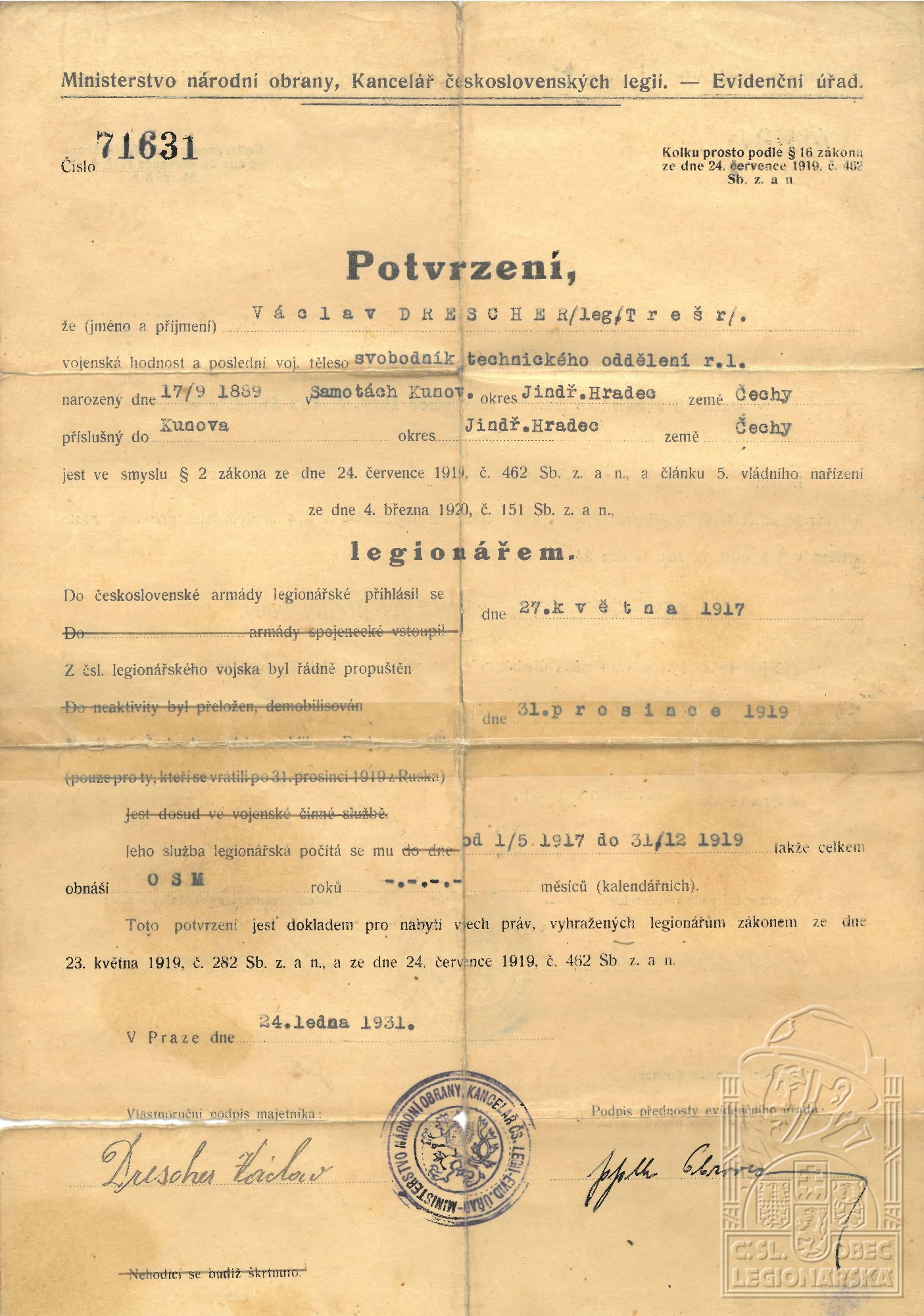Datum podání přihlášky do legií:27.5.1917