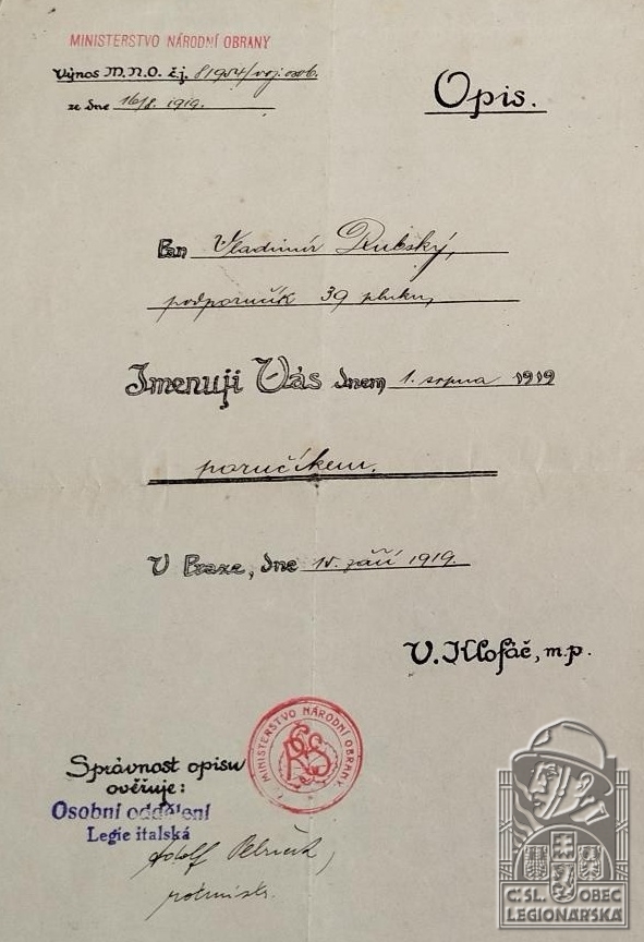 Jednotka v době zařazení:31.p.pl. ( Čs. legie v Itálii )