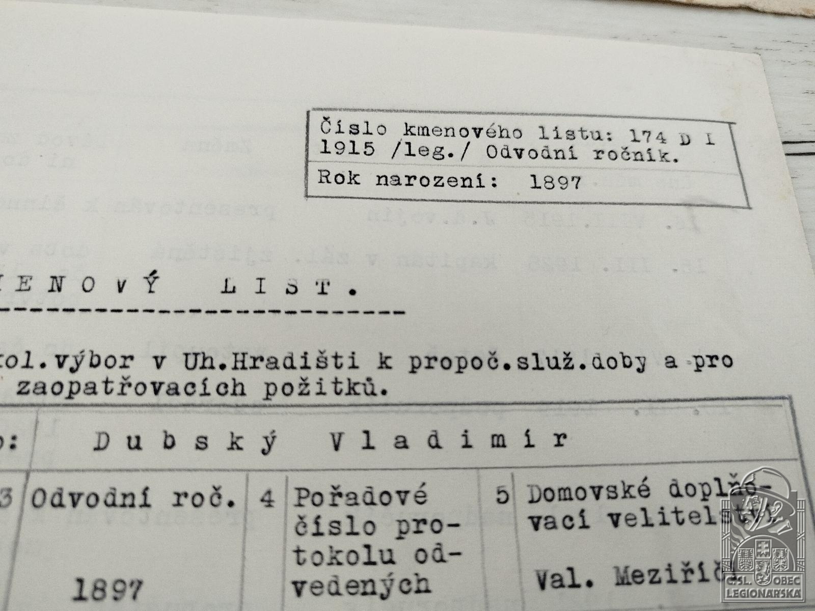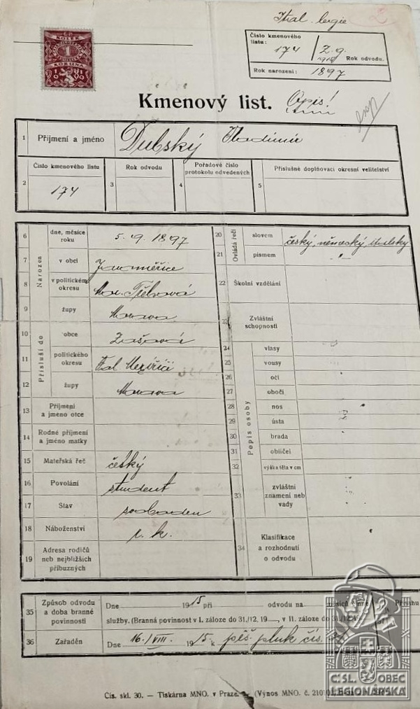 Zdroj informací: legionářský poslužný spis osobní karta legionáře