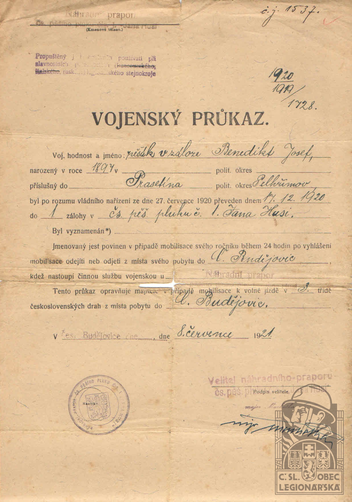 Zdroj informací: legionářský poslužný spis osobní karta legionáře