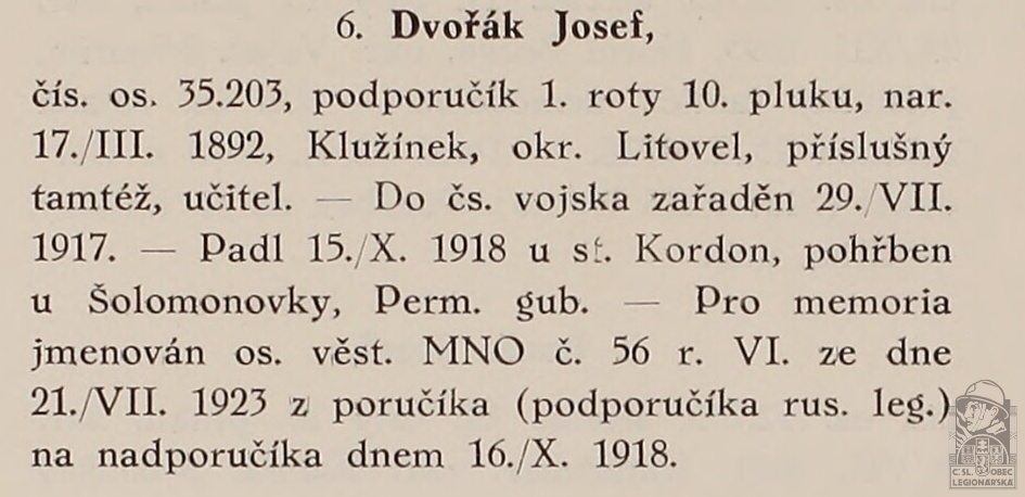 Poznámka:1. rota 10.stř.pl.; zraněn 15.10.1918 u Kordonu, přiložen plánek pohřebiště; Pro memoria jmenován os. věst. MNO č. 56 r. VI. ze dne 21.7.1923 z poručíka (podporučíka rus. legie) na nadporučíka dnesk 16.10.1918