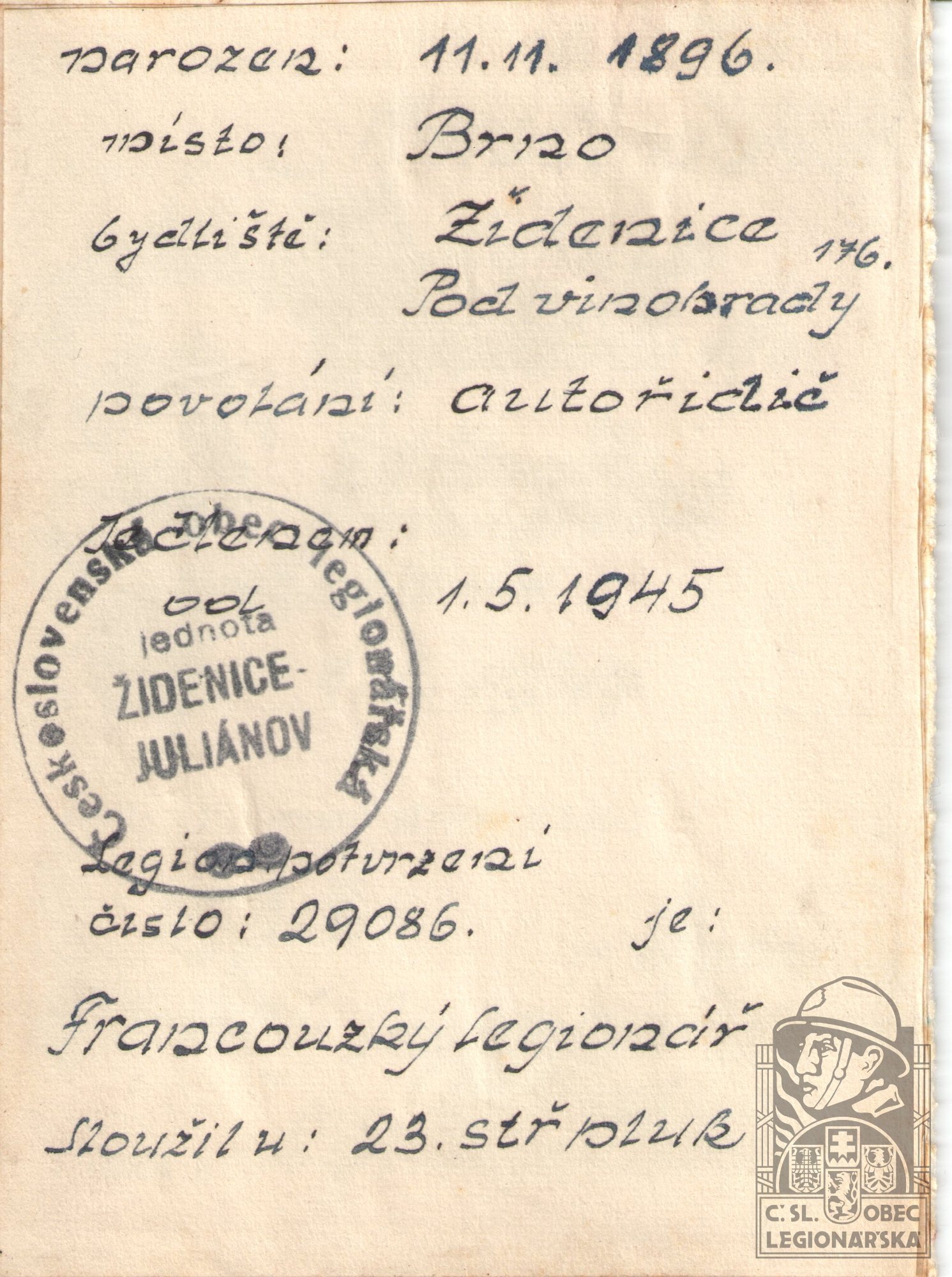 Jednotka v době zařazení:23.p.pl. ( Čs. legie v Francii )