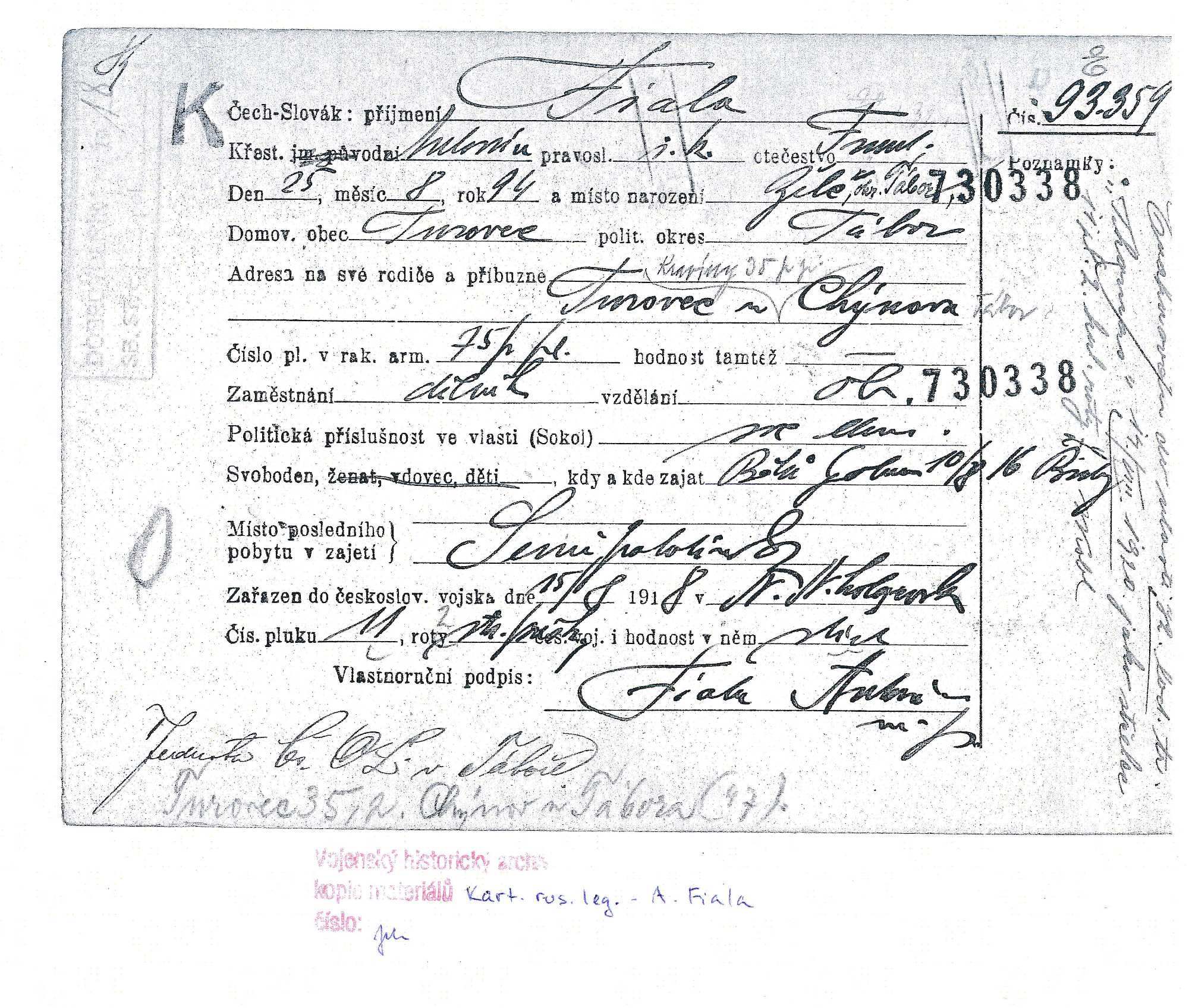 Zdroj informací: legionářský poslužný spis osobní karta legionáře