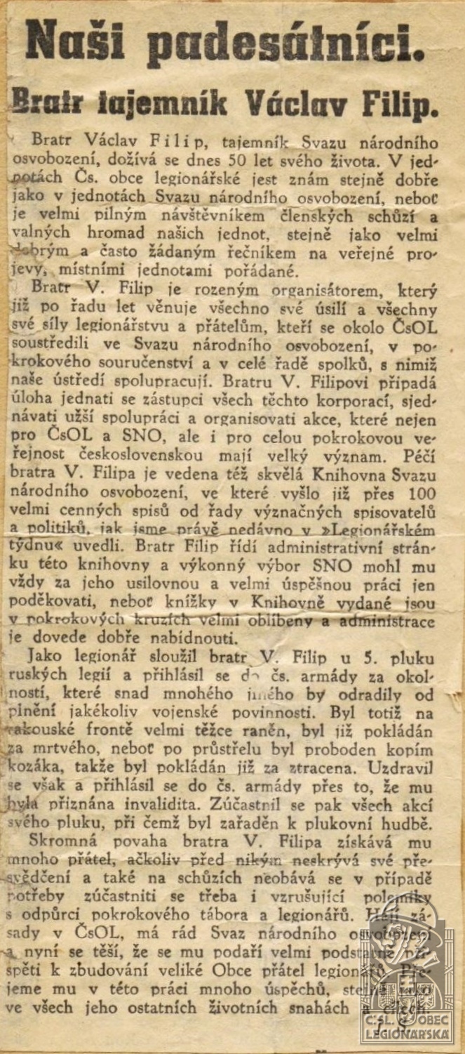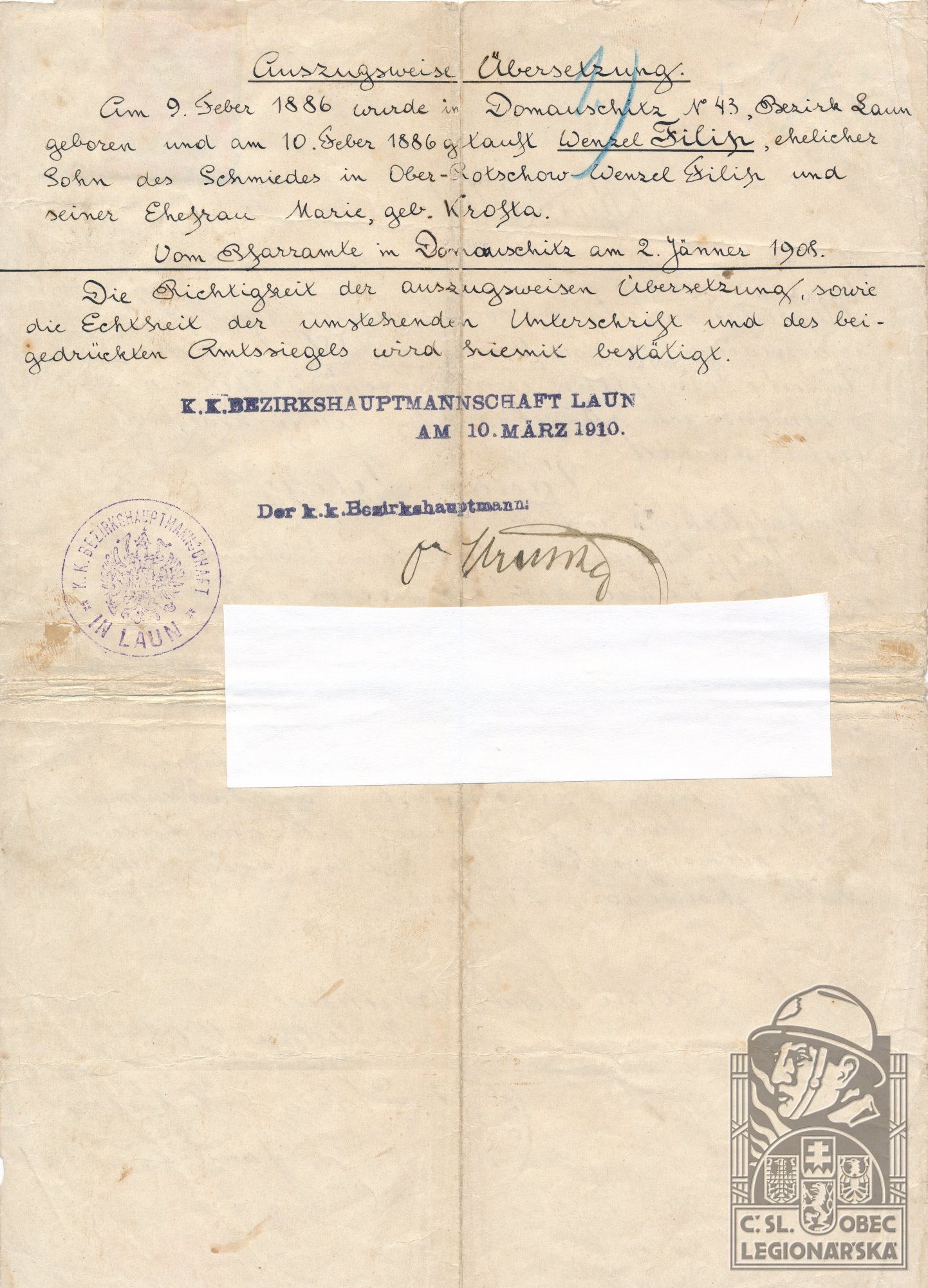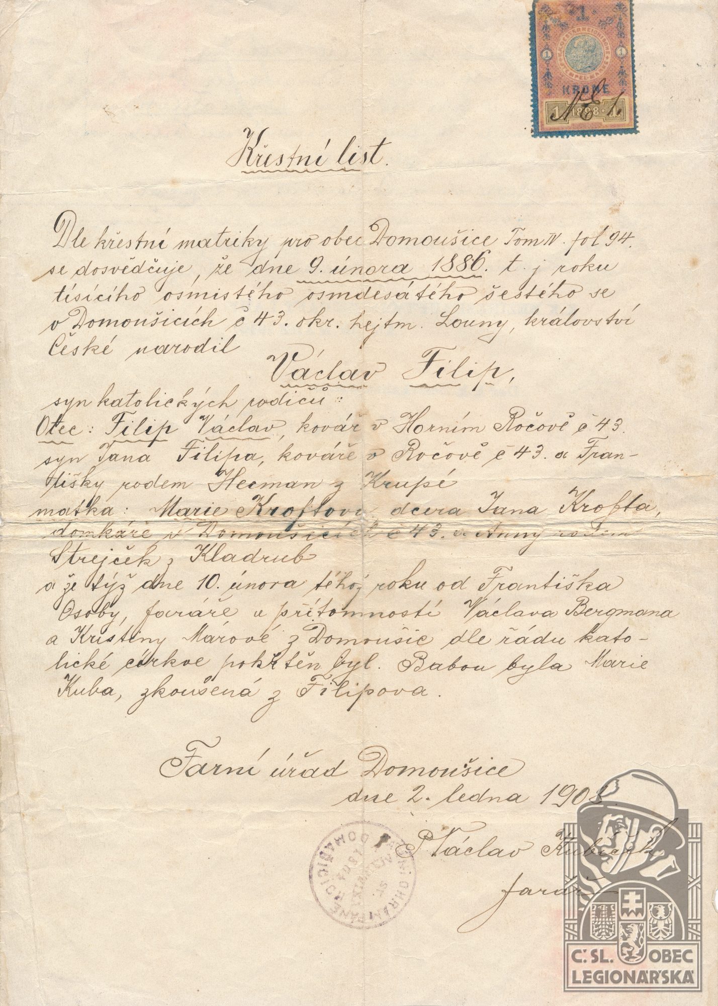 Poznámka:V legiích od 26.6.1917 do 1.1.1920. Členem spolku a časopisu Vystěhovalec a spolku Lidomil z Hamburku
