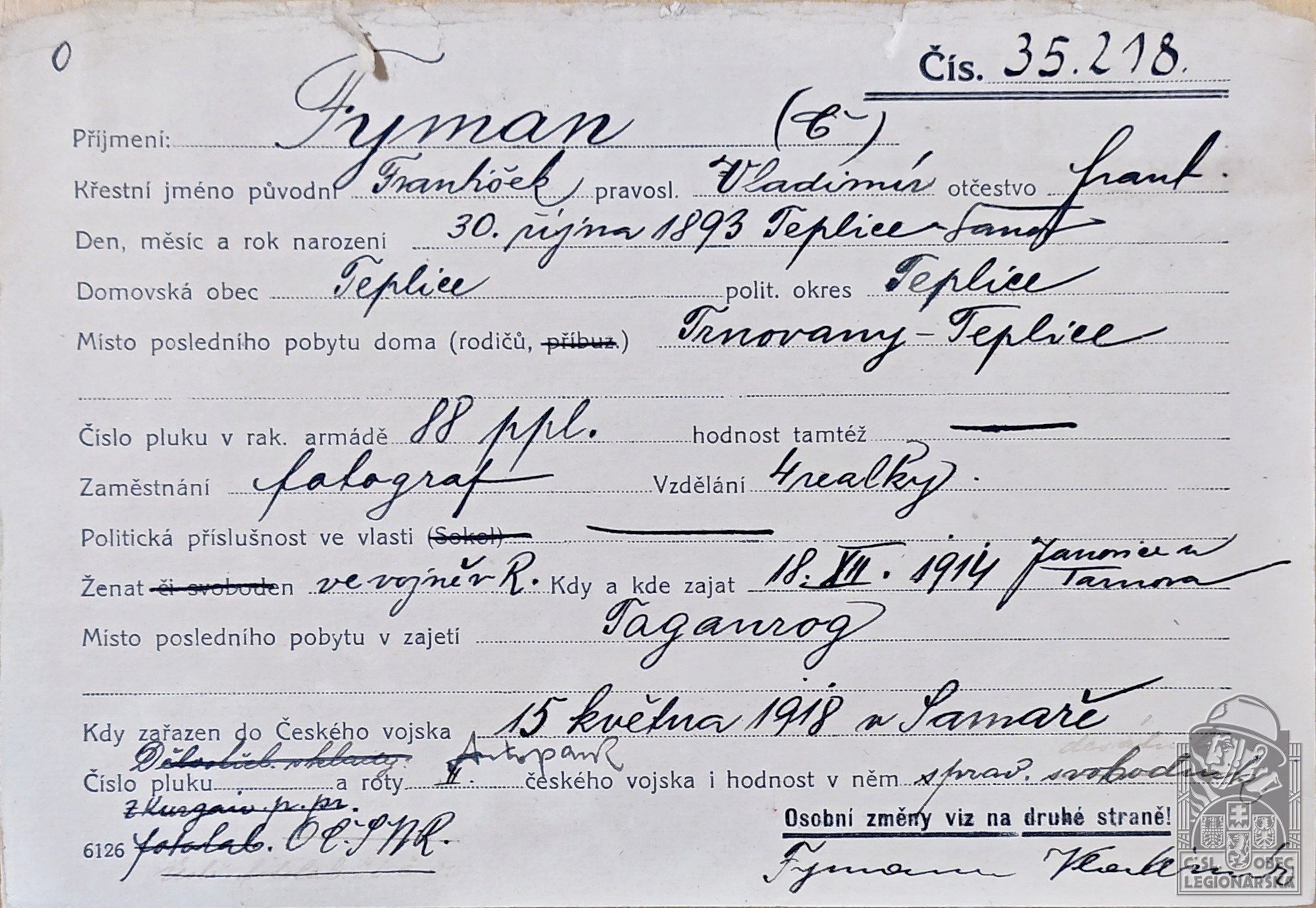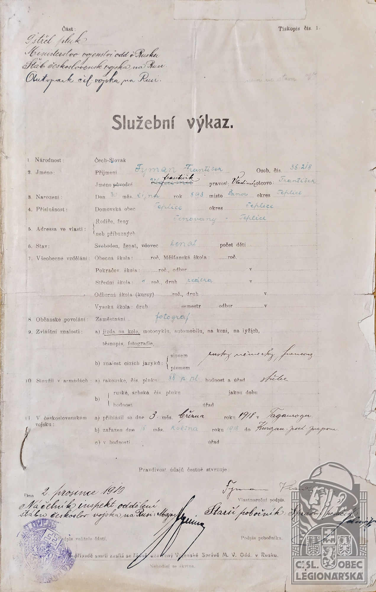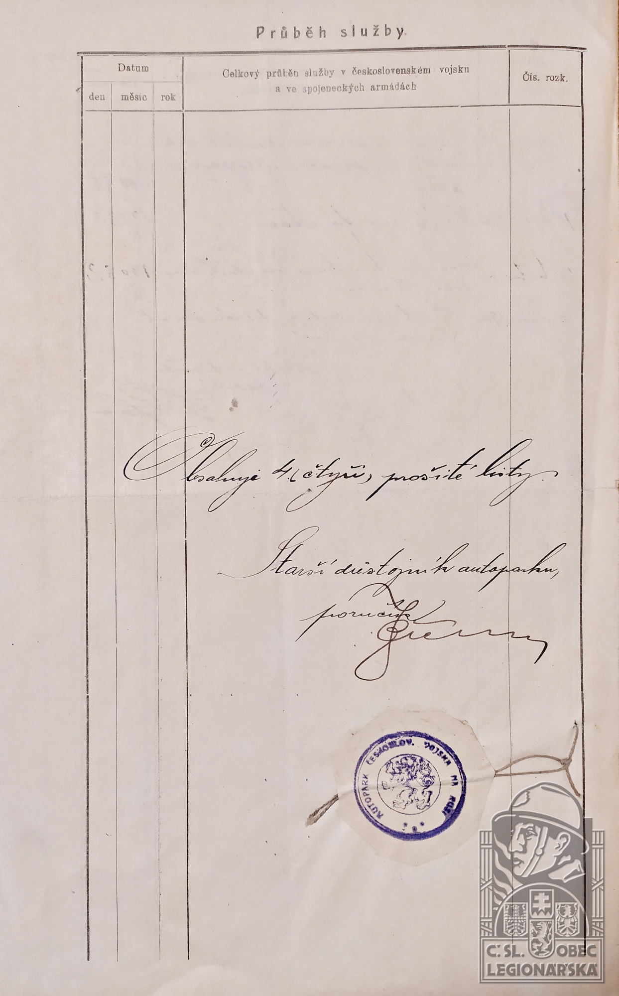Zdroj informací: legionářský poslužný spis osobní karta legionáře