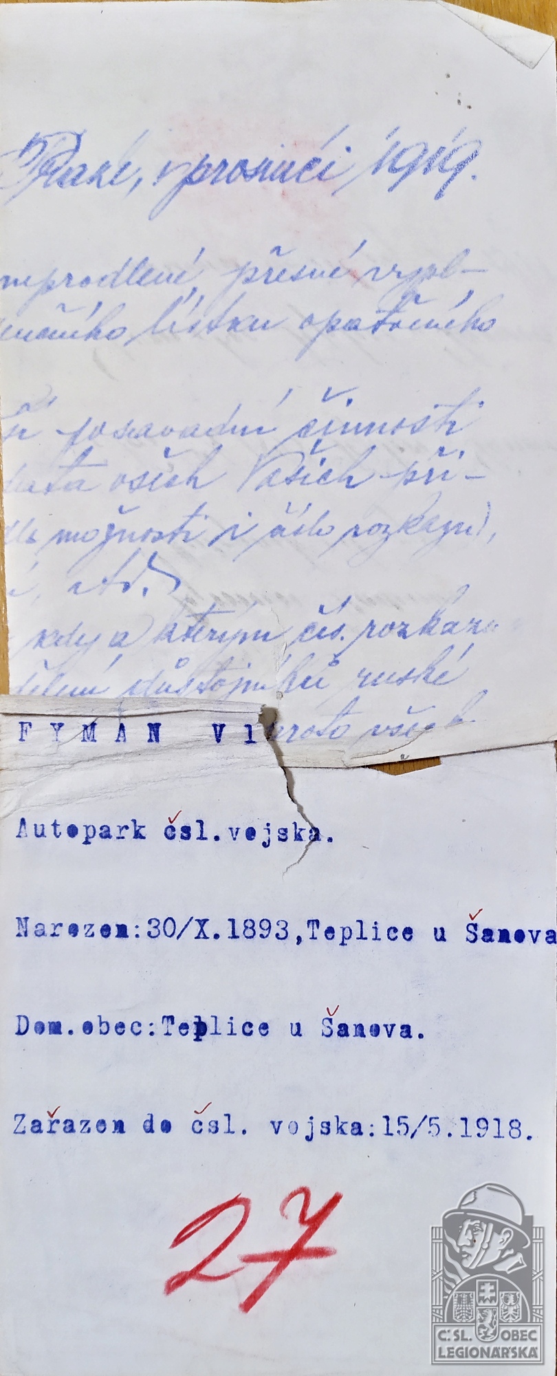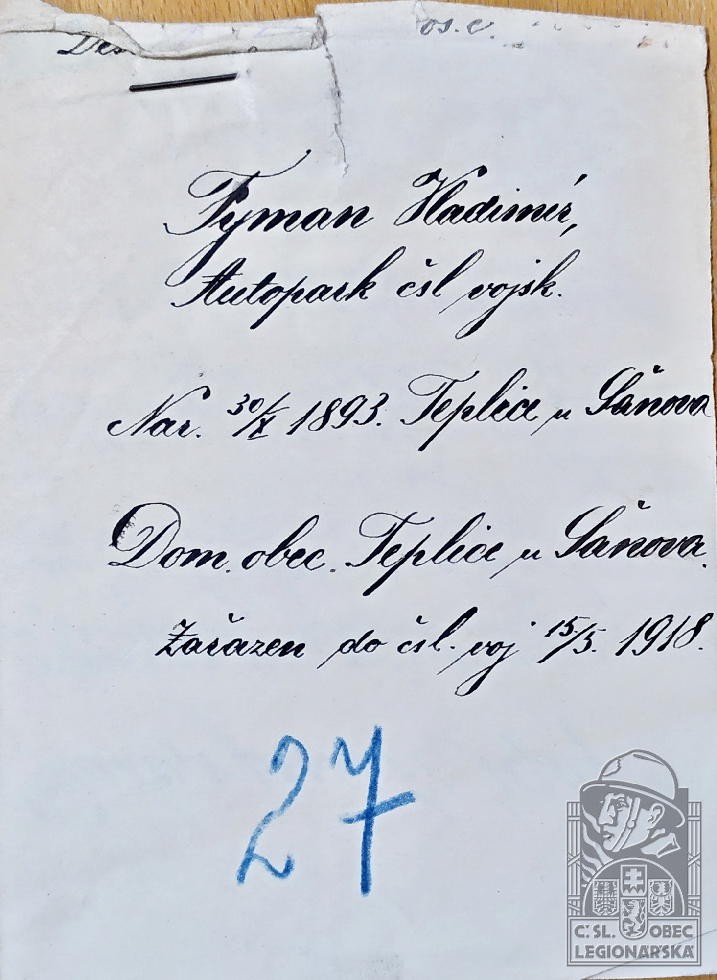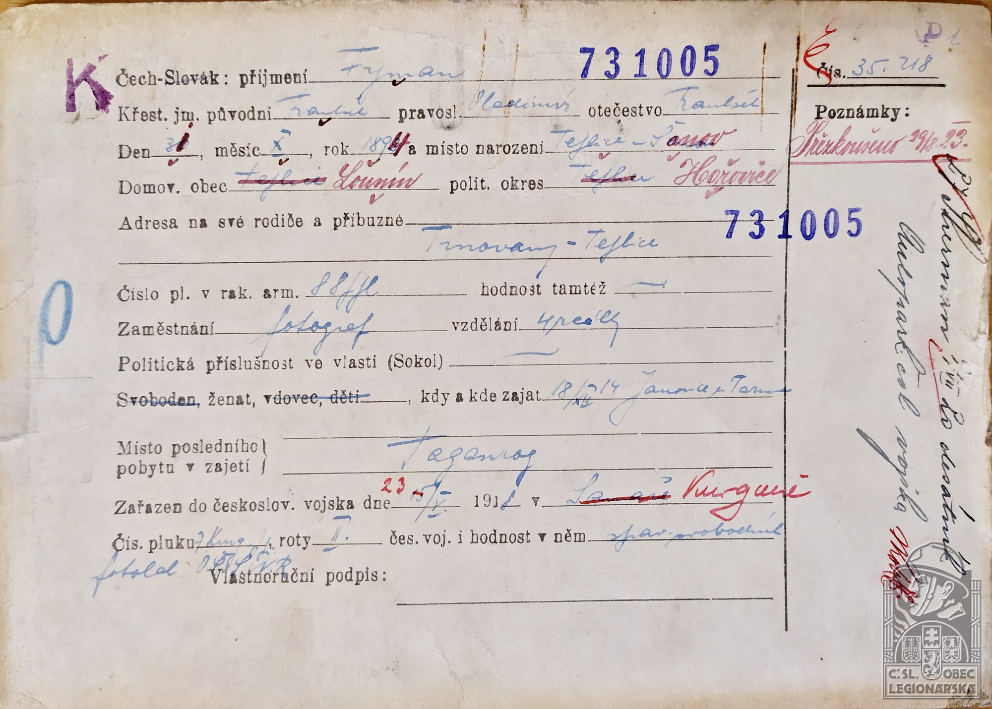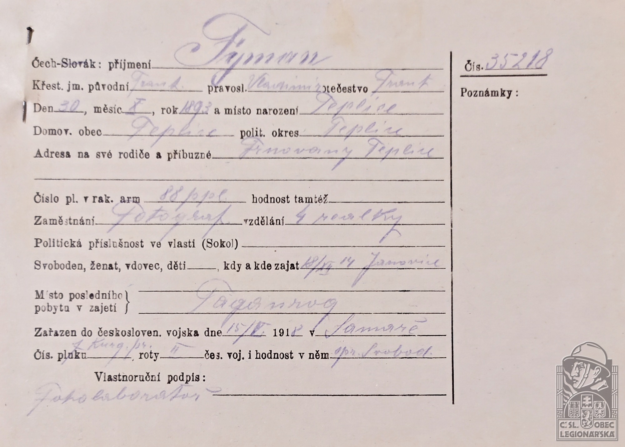 Zdroj informací: legionářský poslužný spis osobní karta legionáře