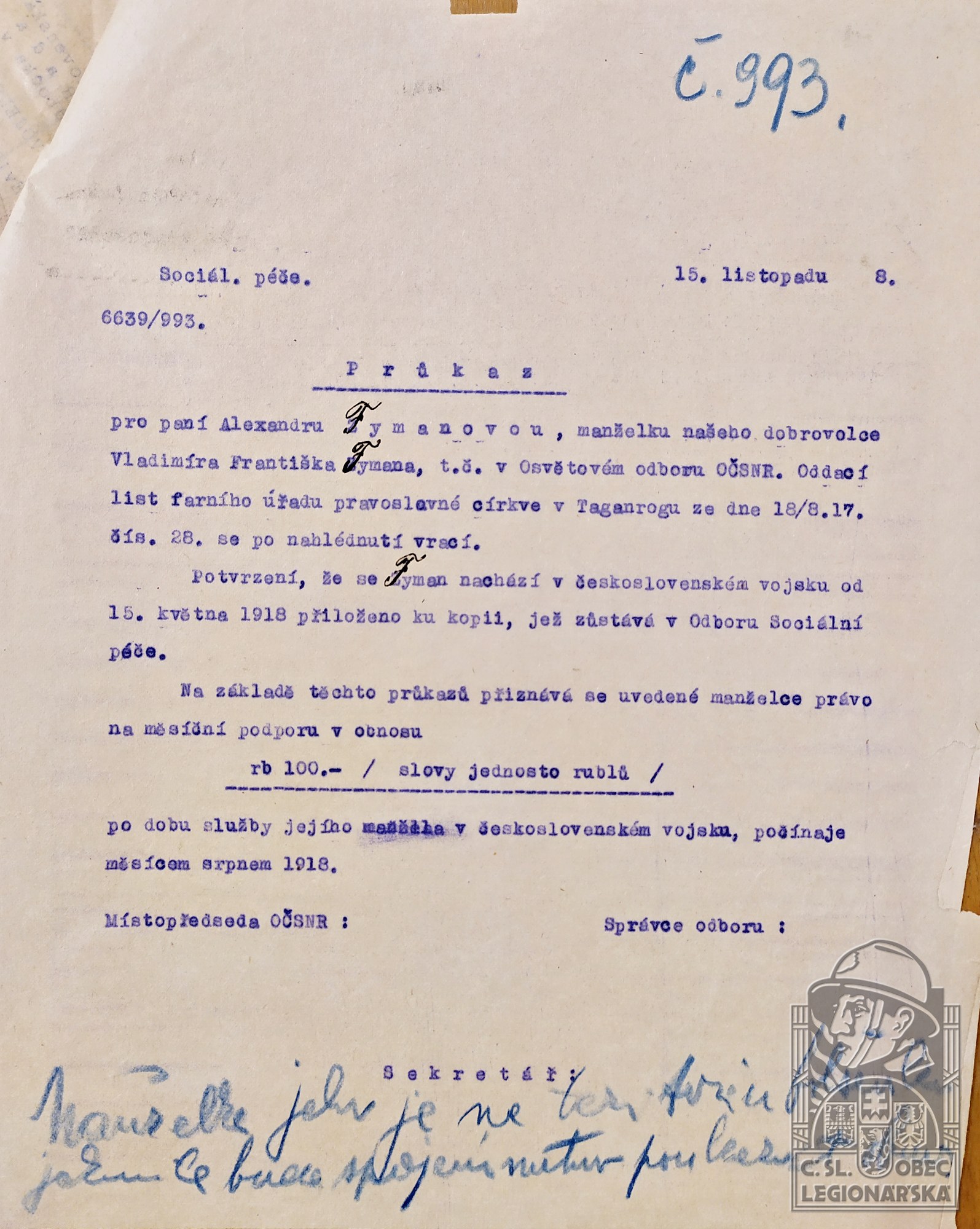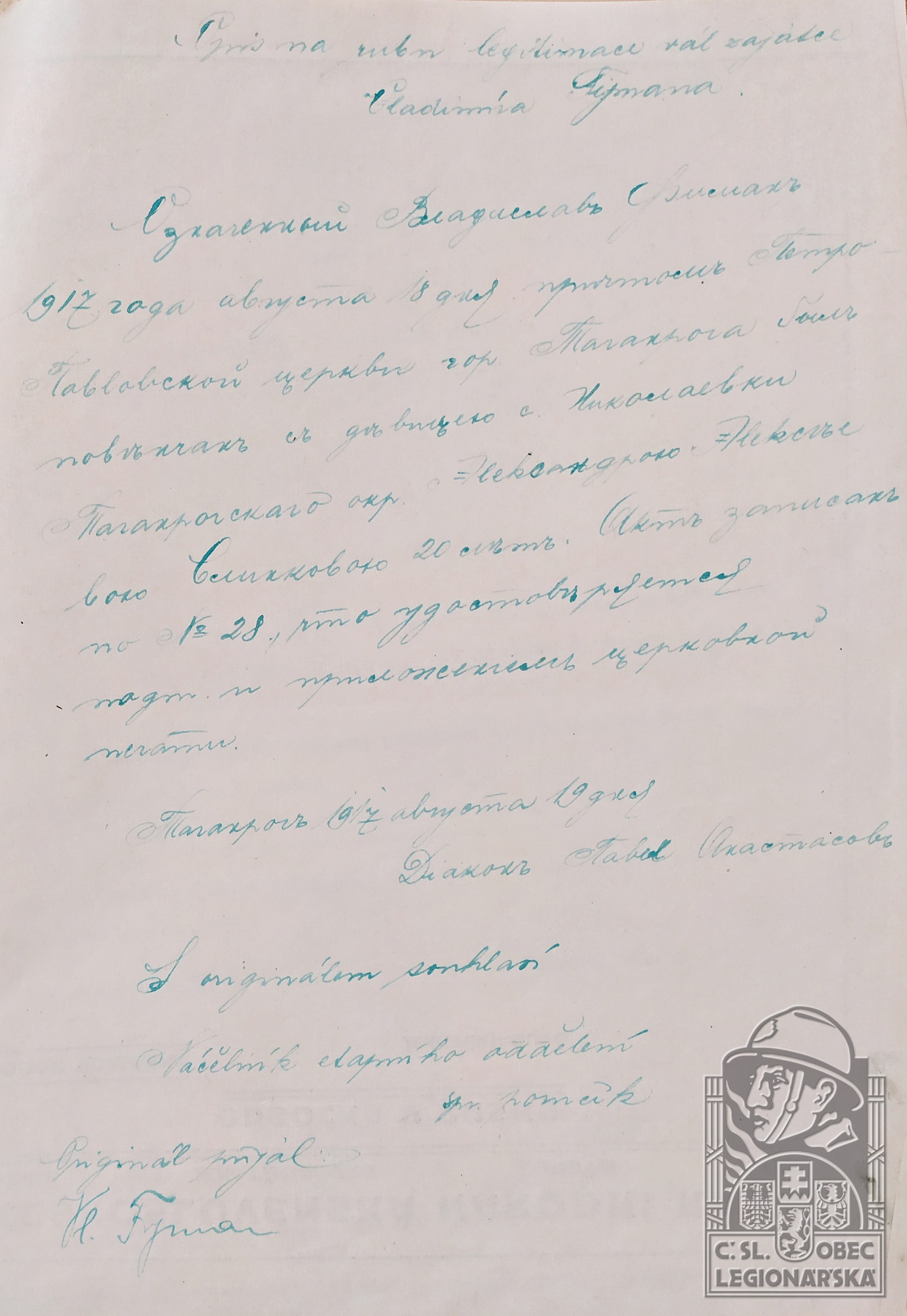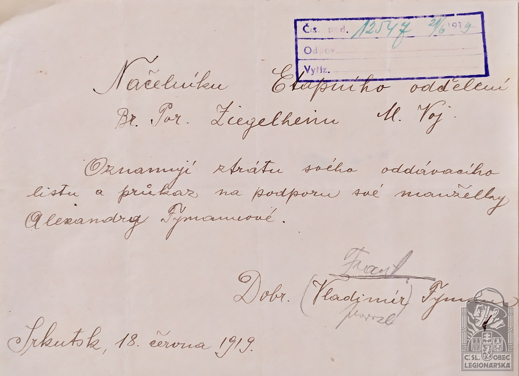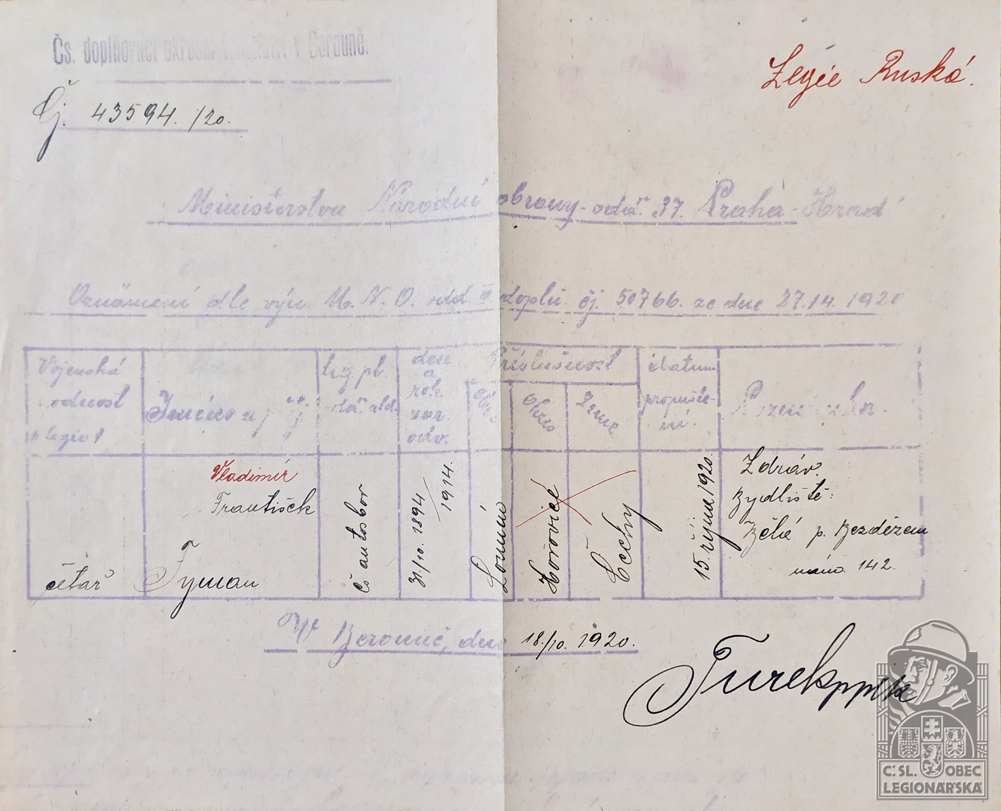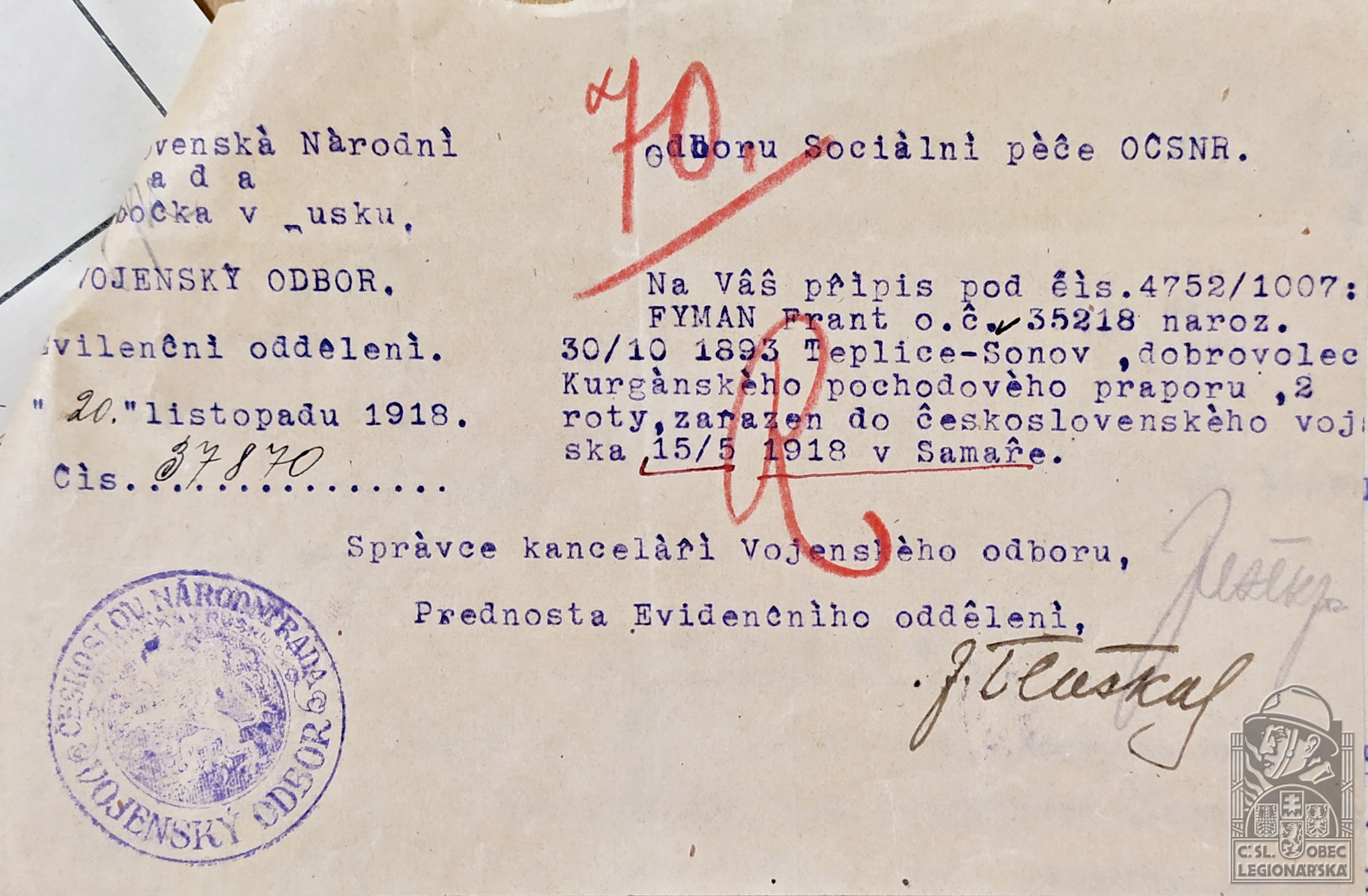 Jednotka v době zařazení:Kurg.pr. ( Čs. legie v Rusku )