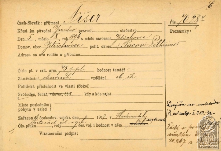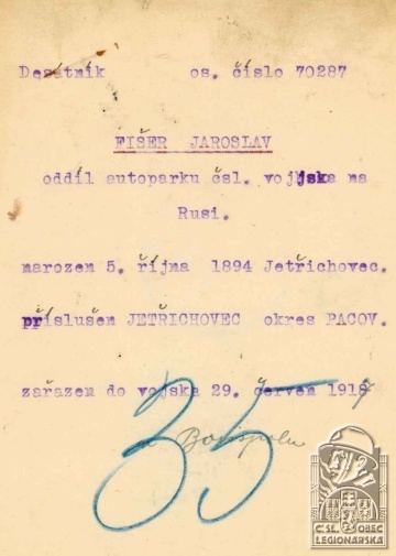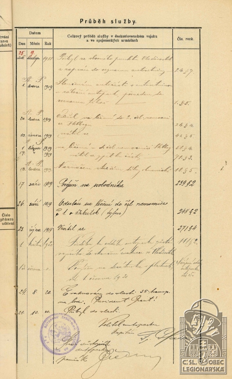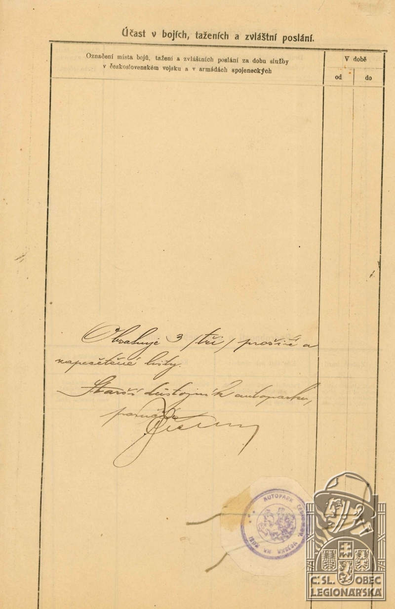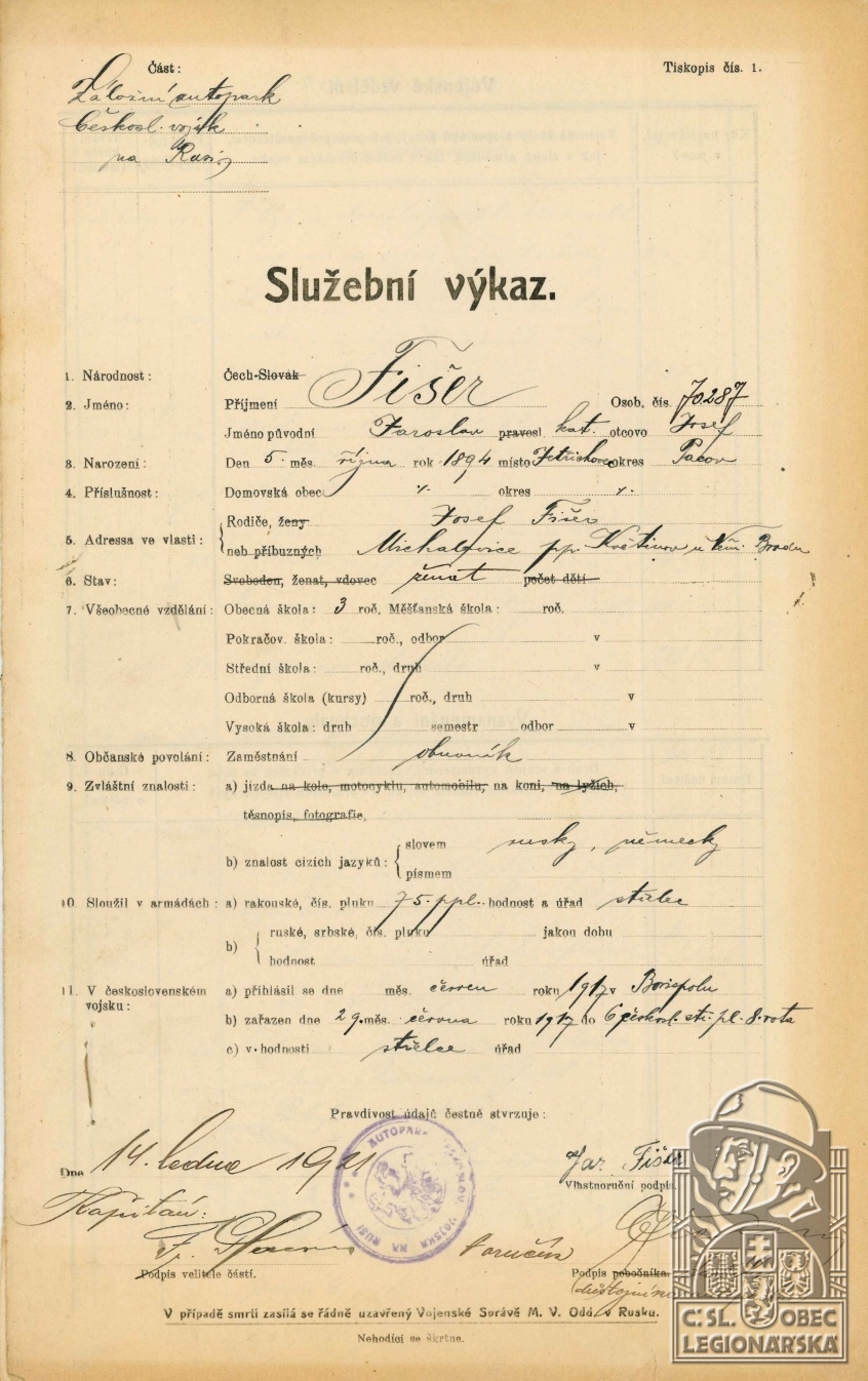 Zdroj informací: legionářský poslužný spis osobní karta legionáře osvědčení o vykonané legionářské službě