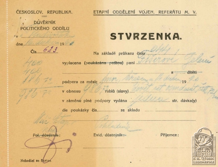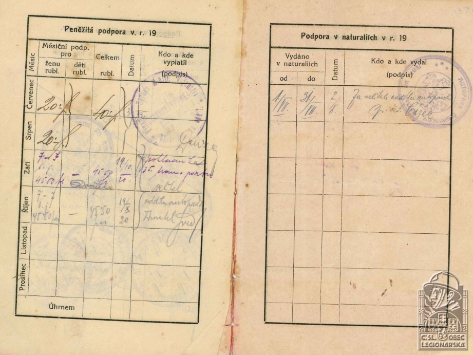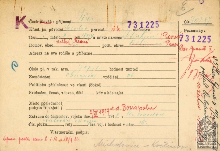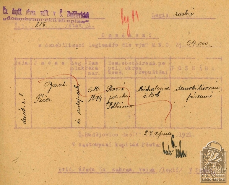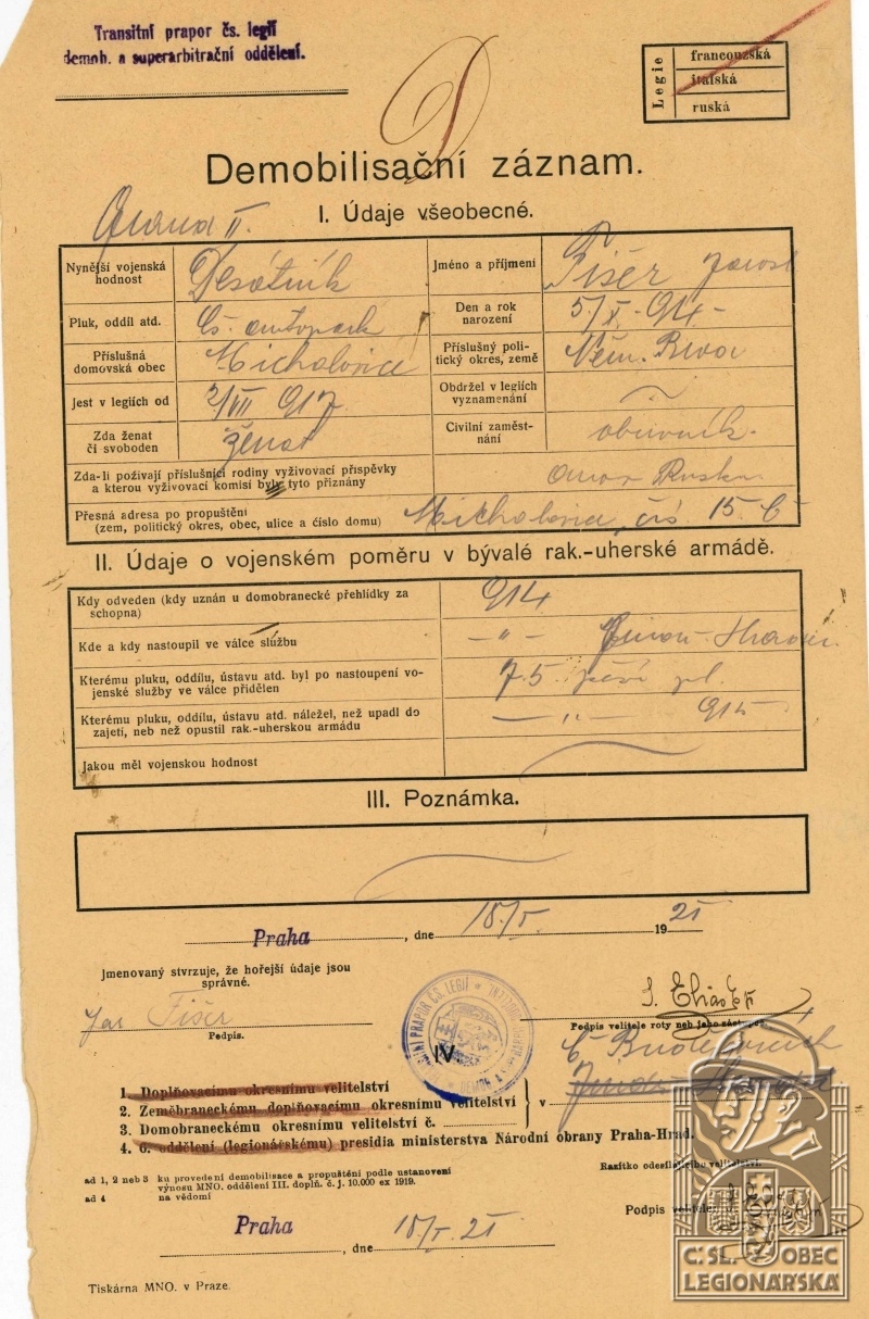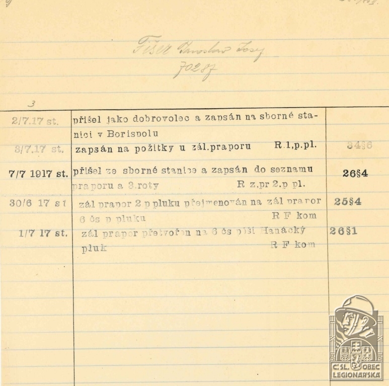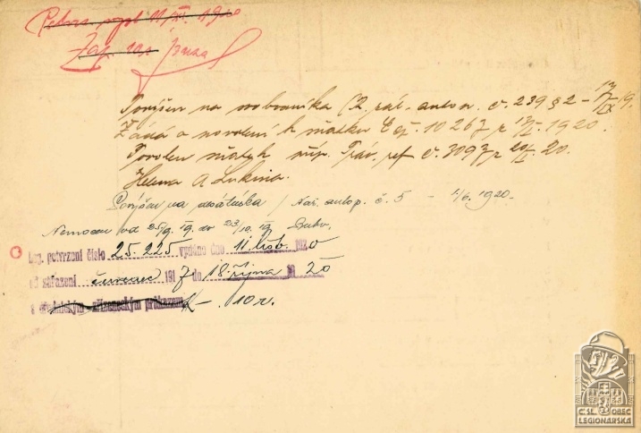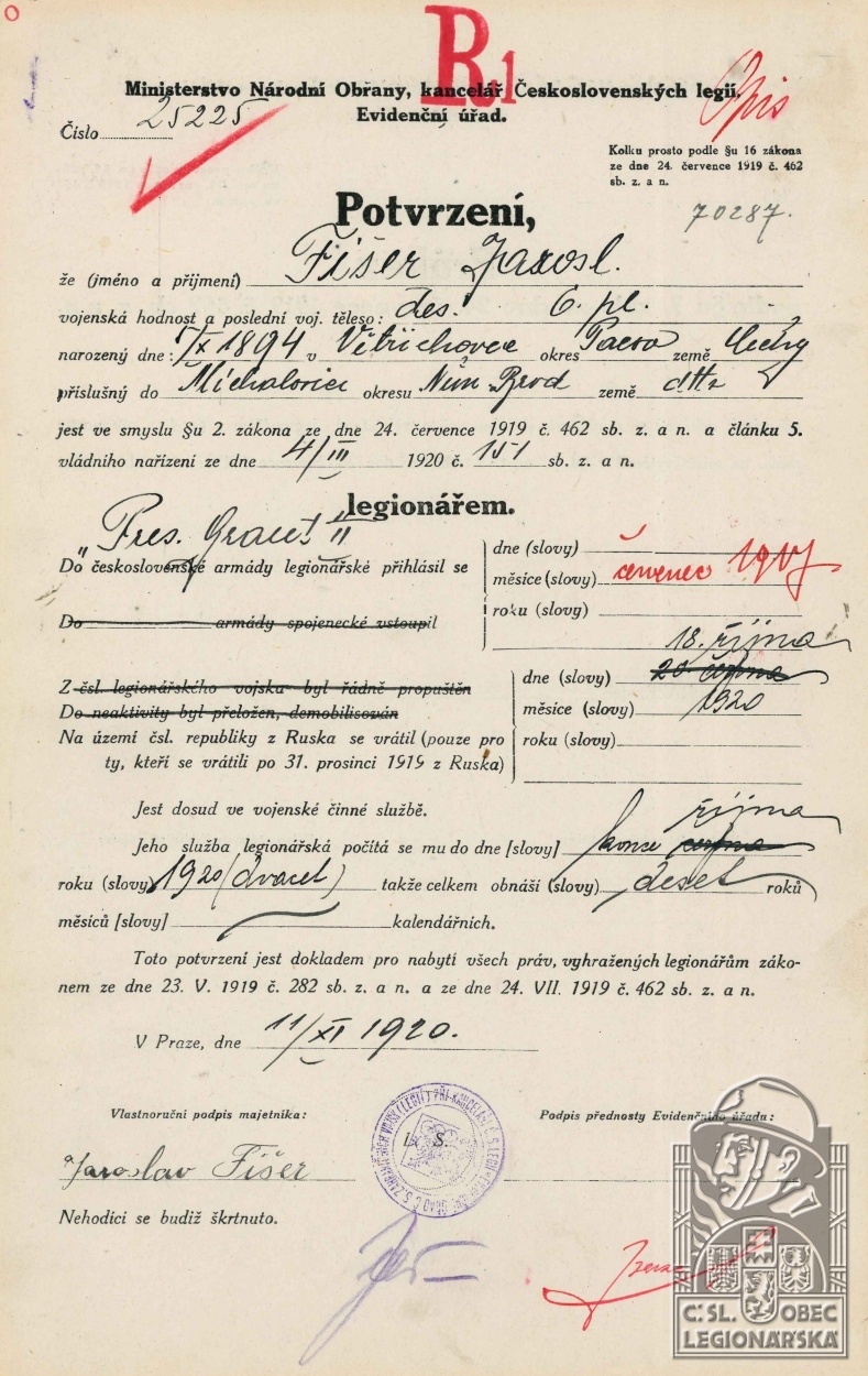 Zdroj informací: legionářský poslužný spis osobní karta legionáře osvědčení o vykonané legionářské službě