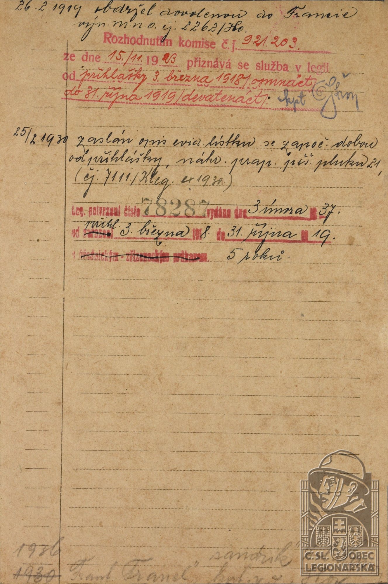 Poznámka:bydliště Nové Dvory, okr.z karty nelze určit, dle lexikonu obcí je N.D.několik, služba v legii od 3.3.1918 do 31.10.1919
