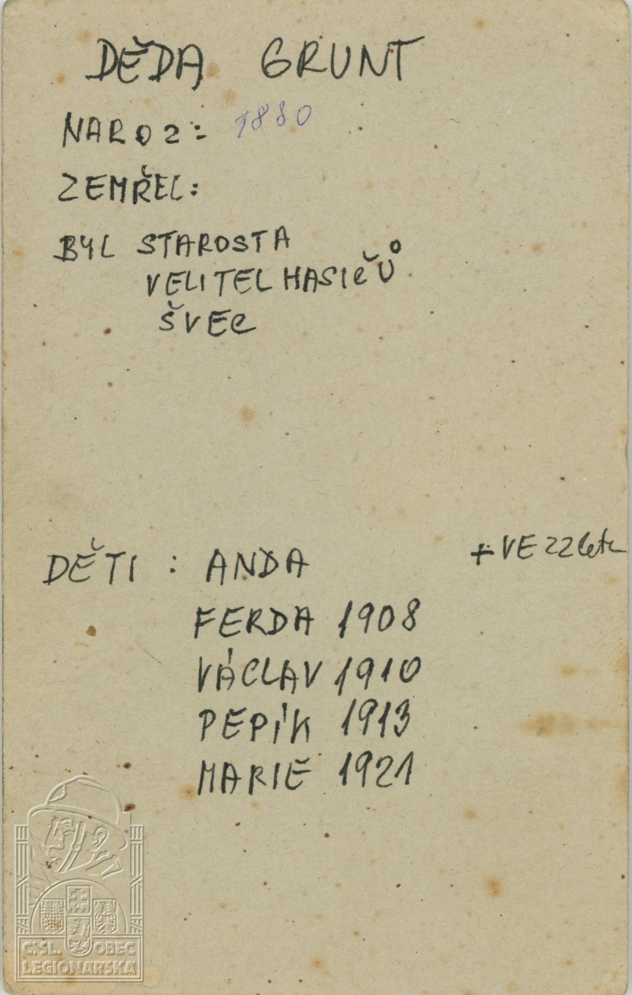 Zdroj informací: legionářský poslužný spis osobní karta legionáře