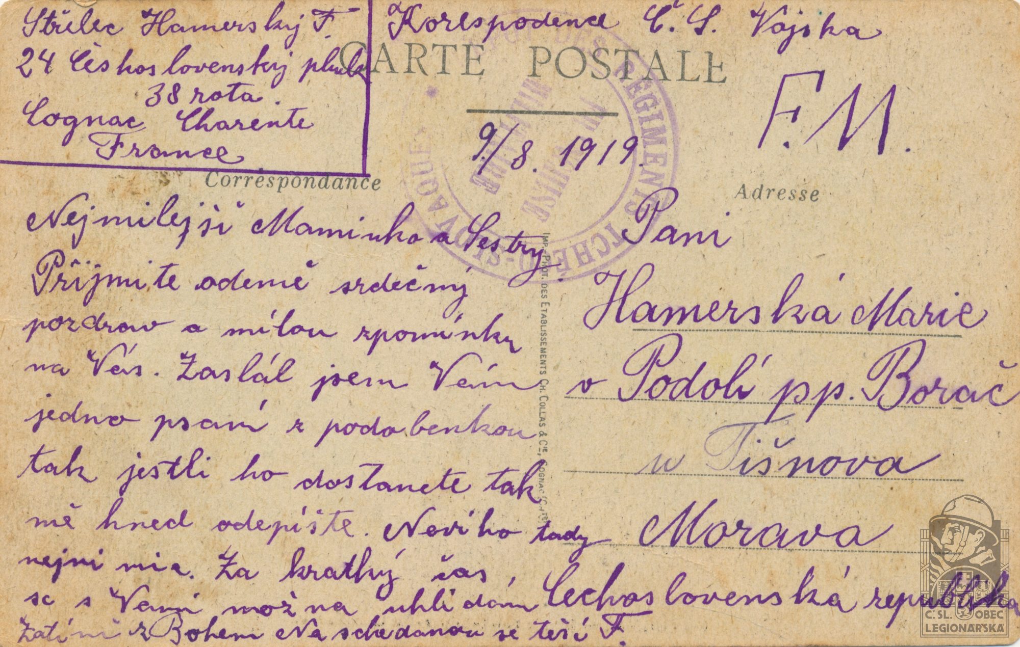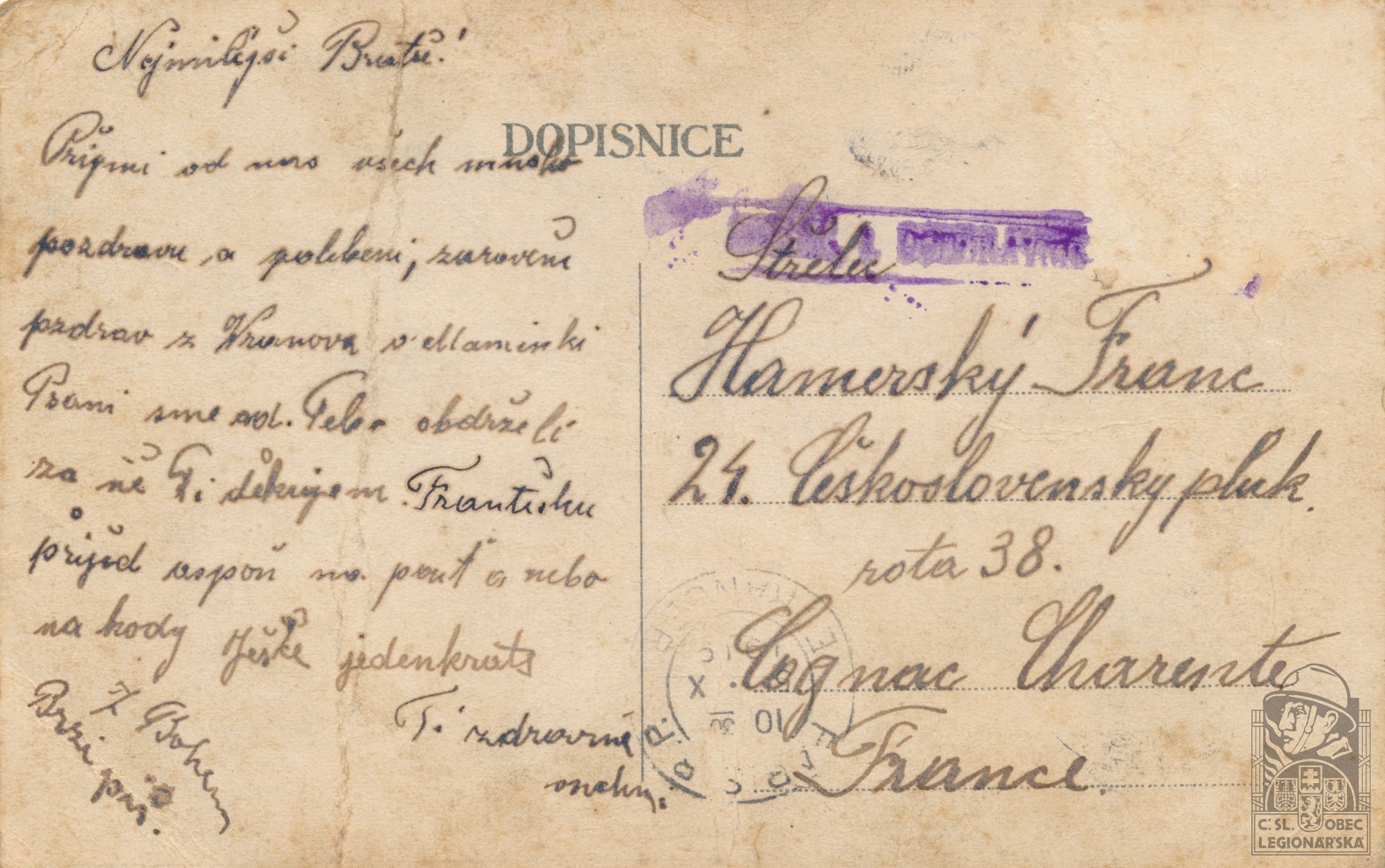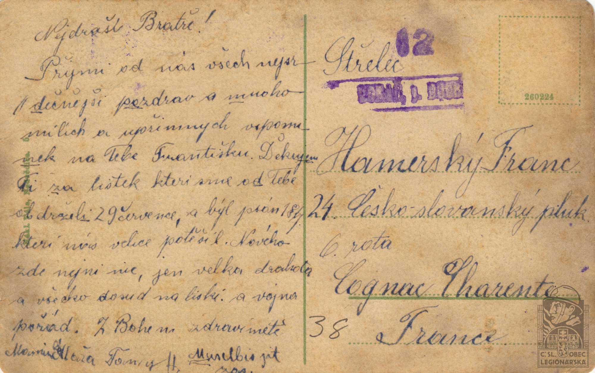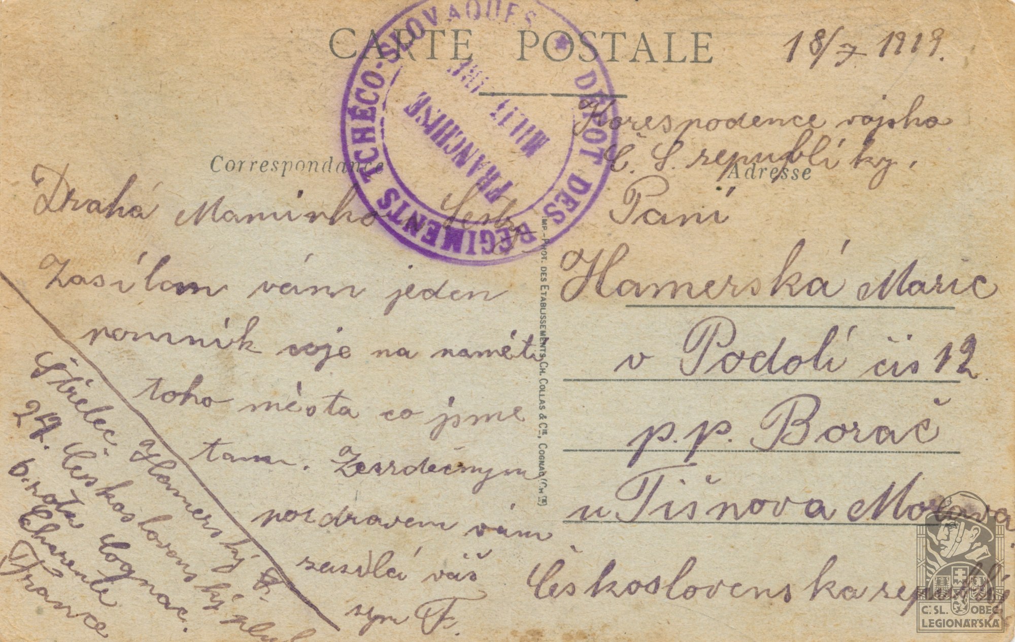 Jednotka v době zařazení:24.p.pl. ( Čs. legie v Francii )