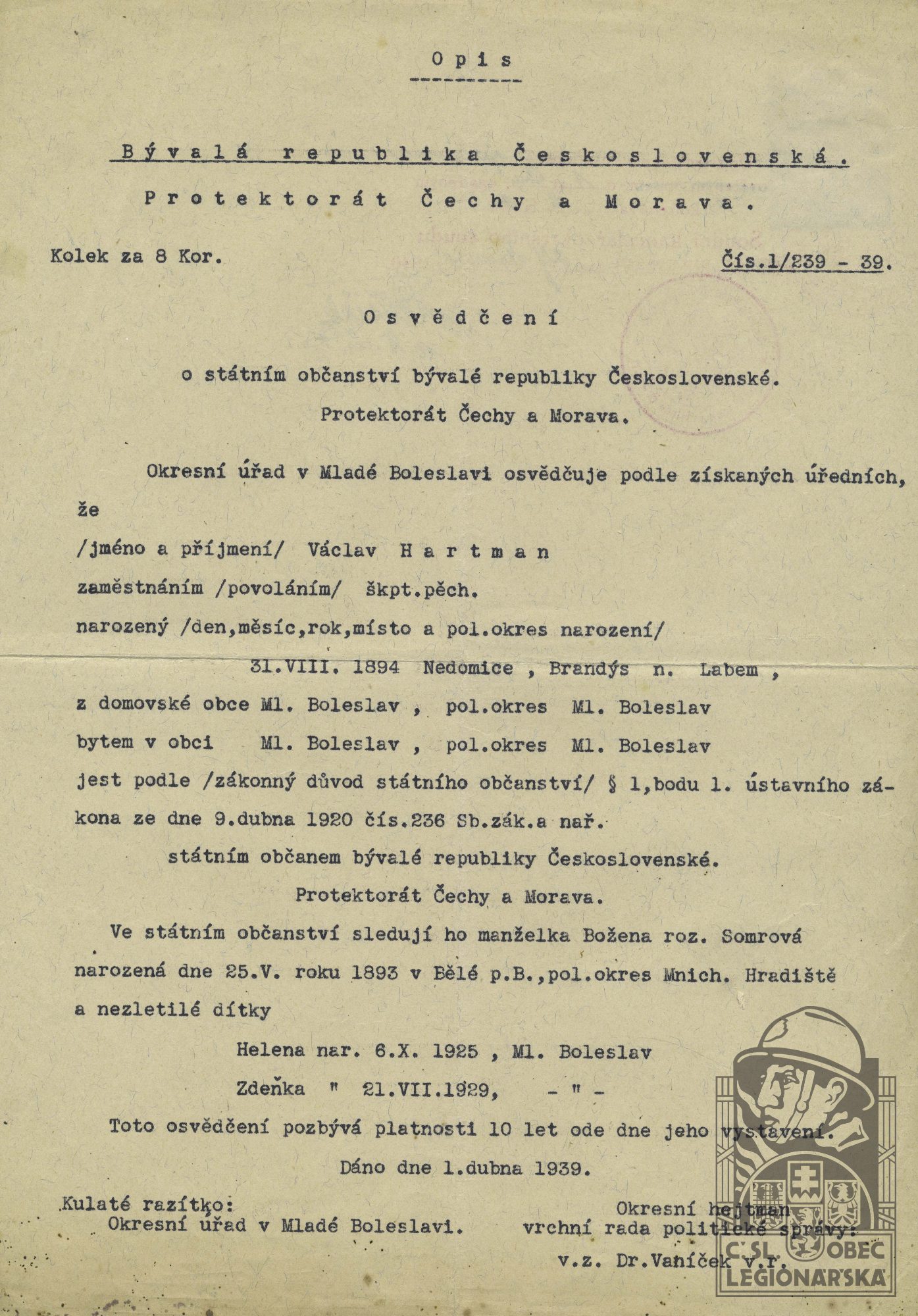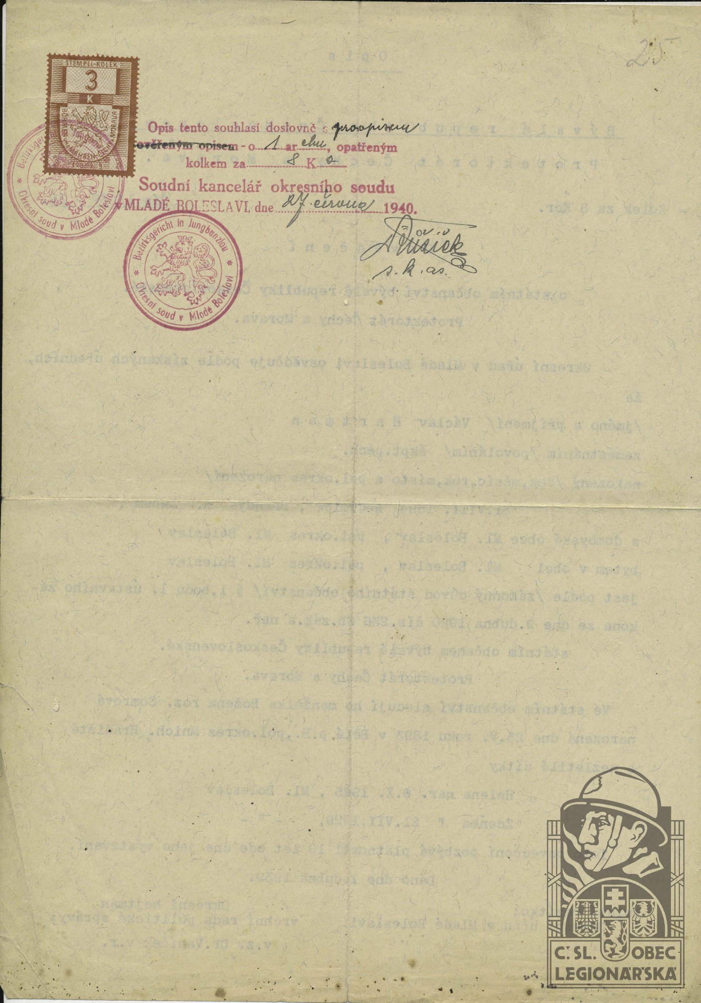 Poznámka:Není legionářem podle zákona čís.462/1919 sb.