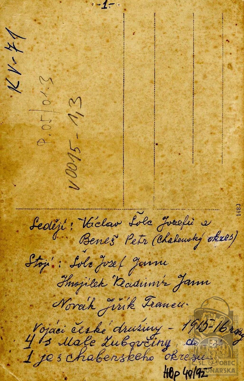 Zdroj informací: legionářský poslužný spis osobní karta legionáře