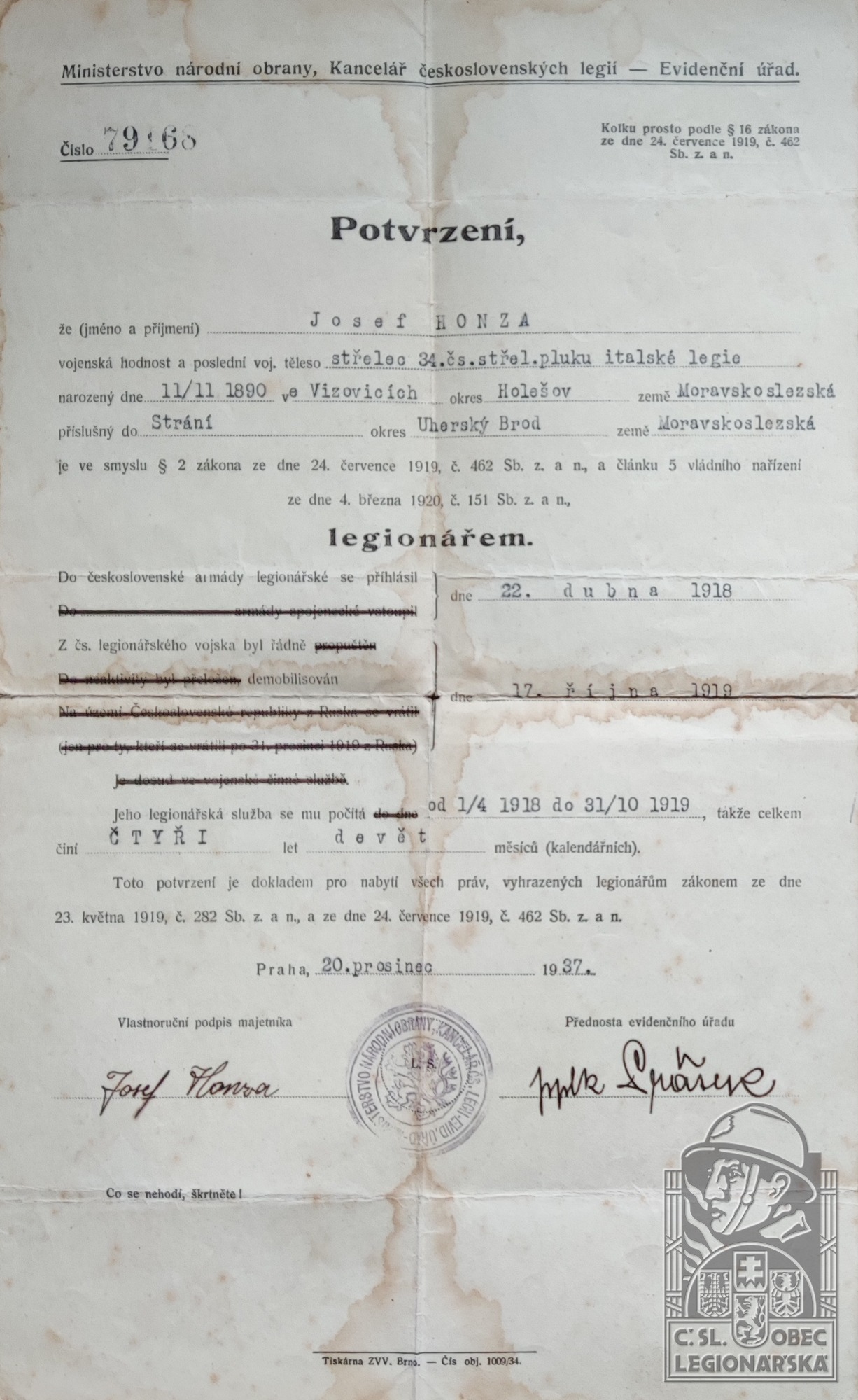 Zdroj informací: legionářský poslužný spis osobní karta legionáře