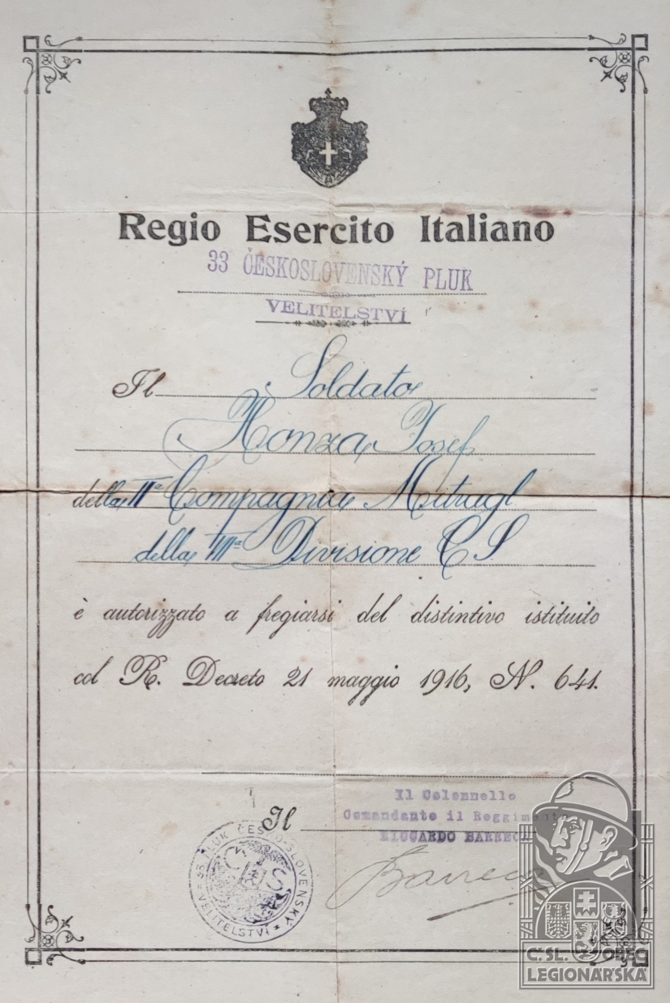 Jednotka v době zařazení:33.p.pl. ( Čs. legie v Itálii )