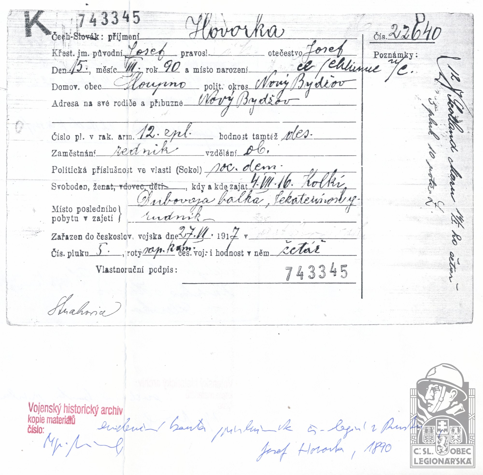 Zdroj informací: legionářský poslužný spis osobní karta legionáře