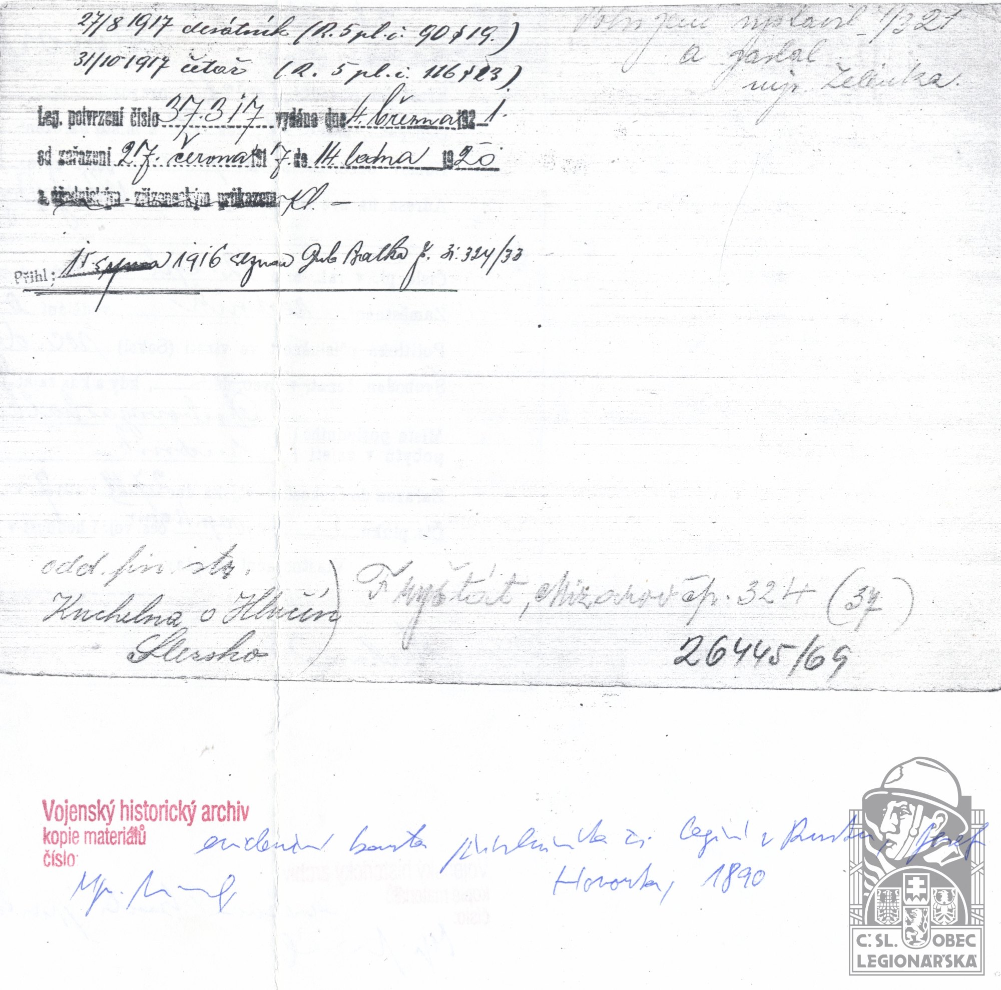 Datum podání přihlášky do legií:20.6.1917