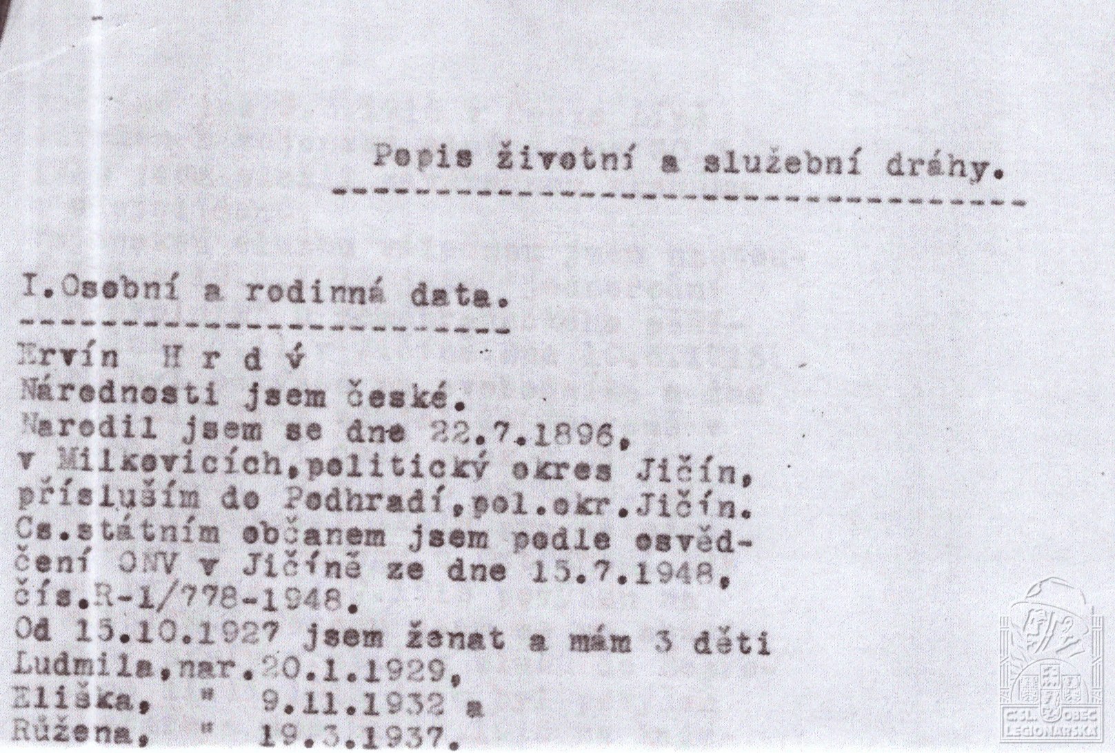 Zdroj informací: legionářský poslužný spis osobní karta legionáře
