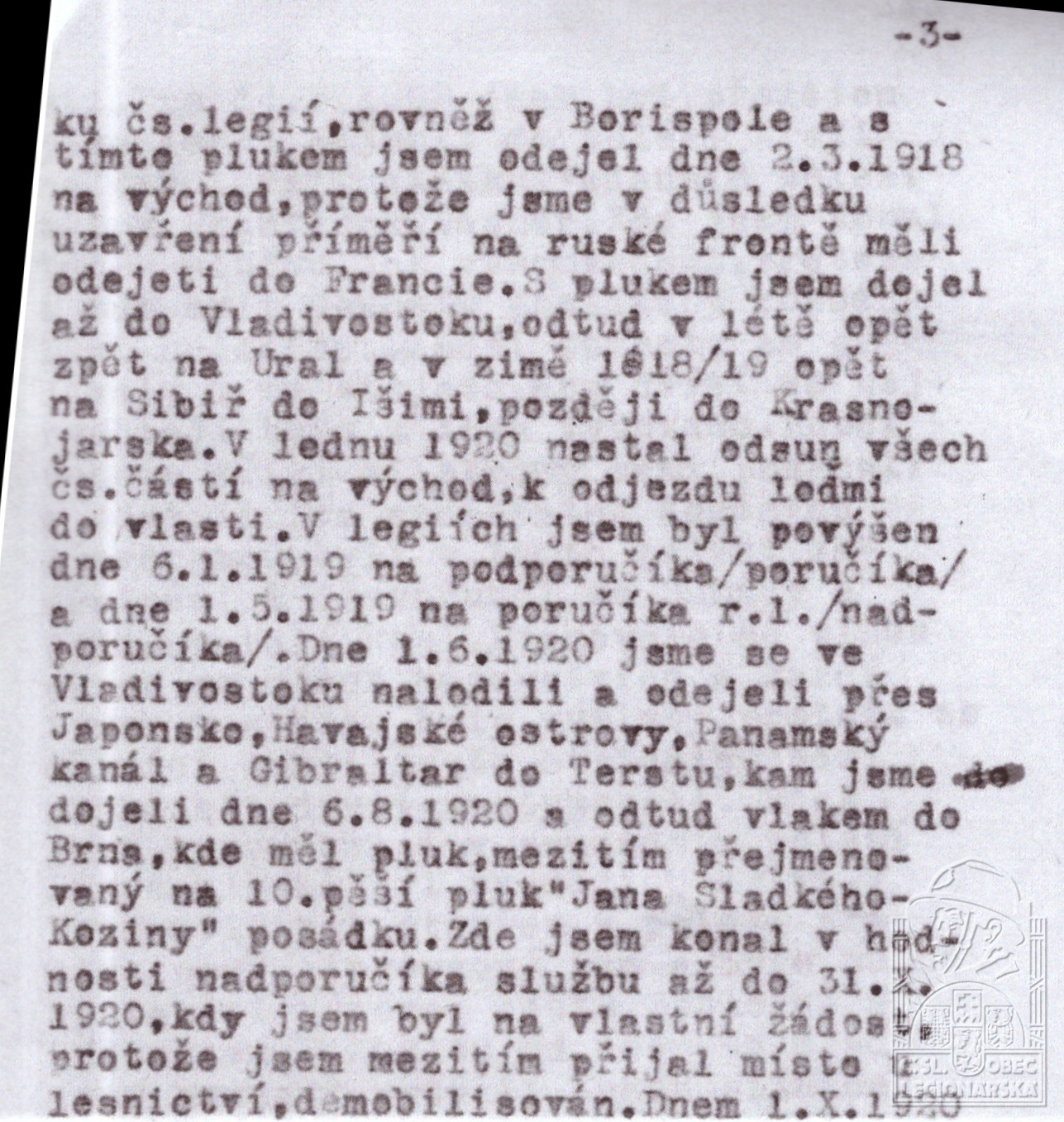 Jednotka v době zařazení:10.stř.pl. ( Čs. legie v Rusku )