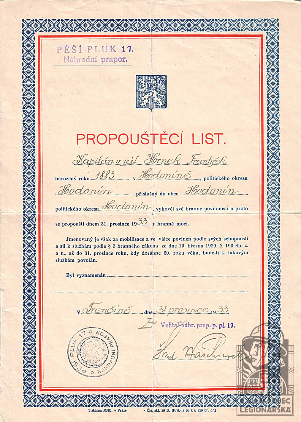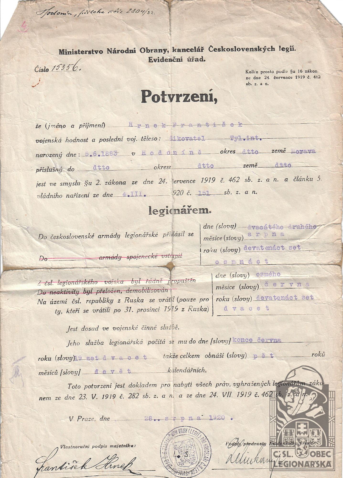 Konec v legiích:8.6.1920 ( Vrátil se do vlasti )