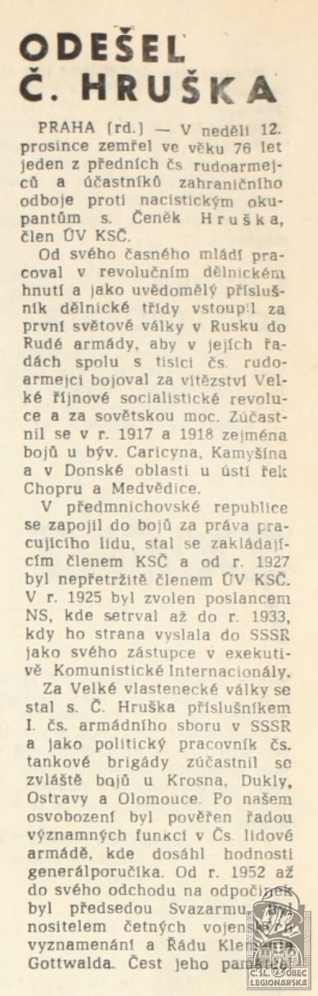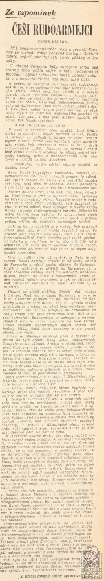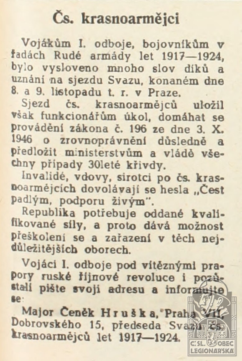 Poznámka:do LR se přihlásil, ale nevstoupil. Vstoupil 1.5.1918 do Rudé armády, z té byl na vlastní žádost propuštěn po onemocnění tyfem. Jako vál. zajatec se vrátil do republiky. Zde se zapojil do komunistického hnutí. Charakter legionáře neměl. Za 1. republiky byl veden jako zběh, bojující proti LR. Charakter legionáře mu byl udělěn v r. 1950.