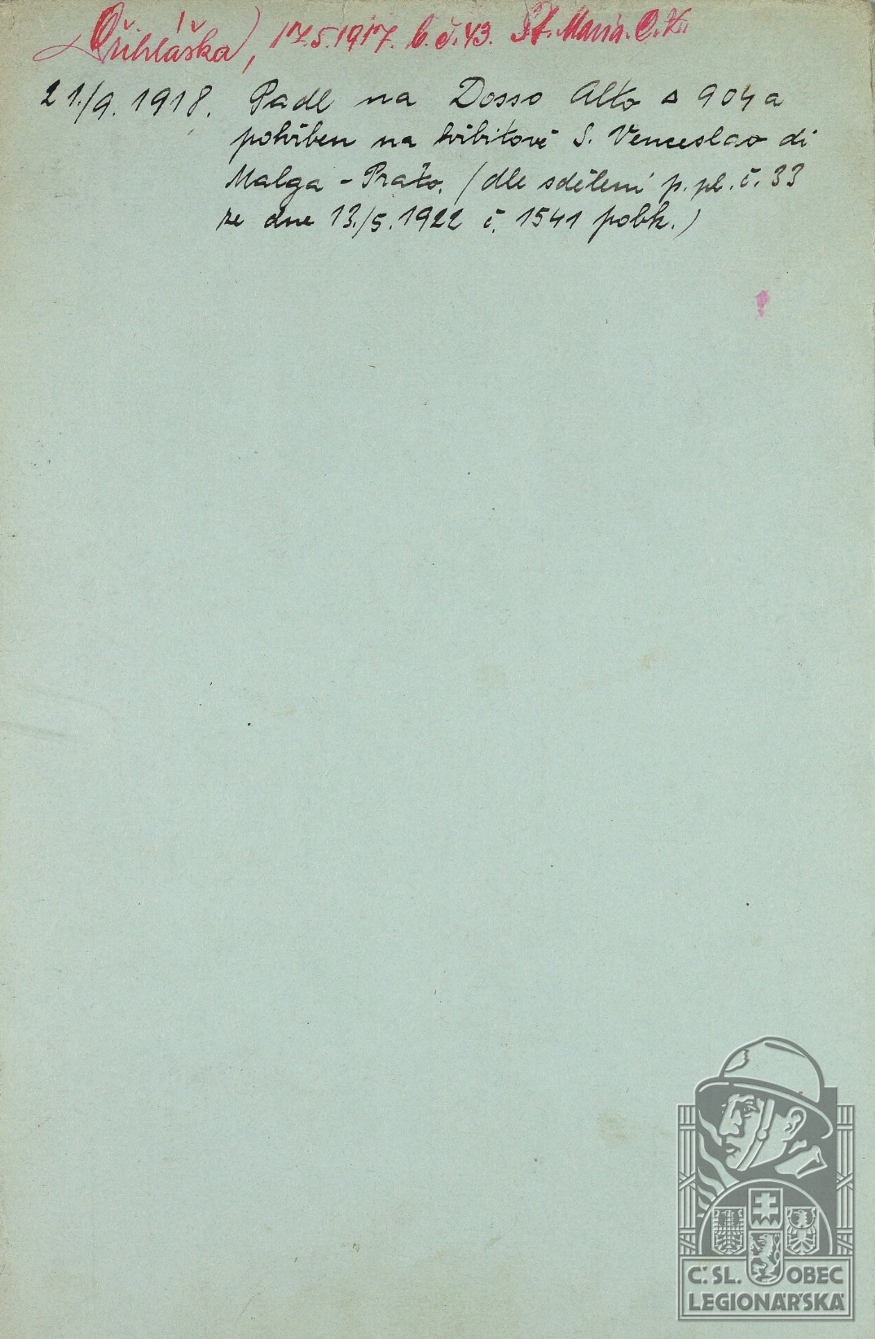 Jednotka v době zařazení:33.p.pl. ( Čs. legie v Itálii )