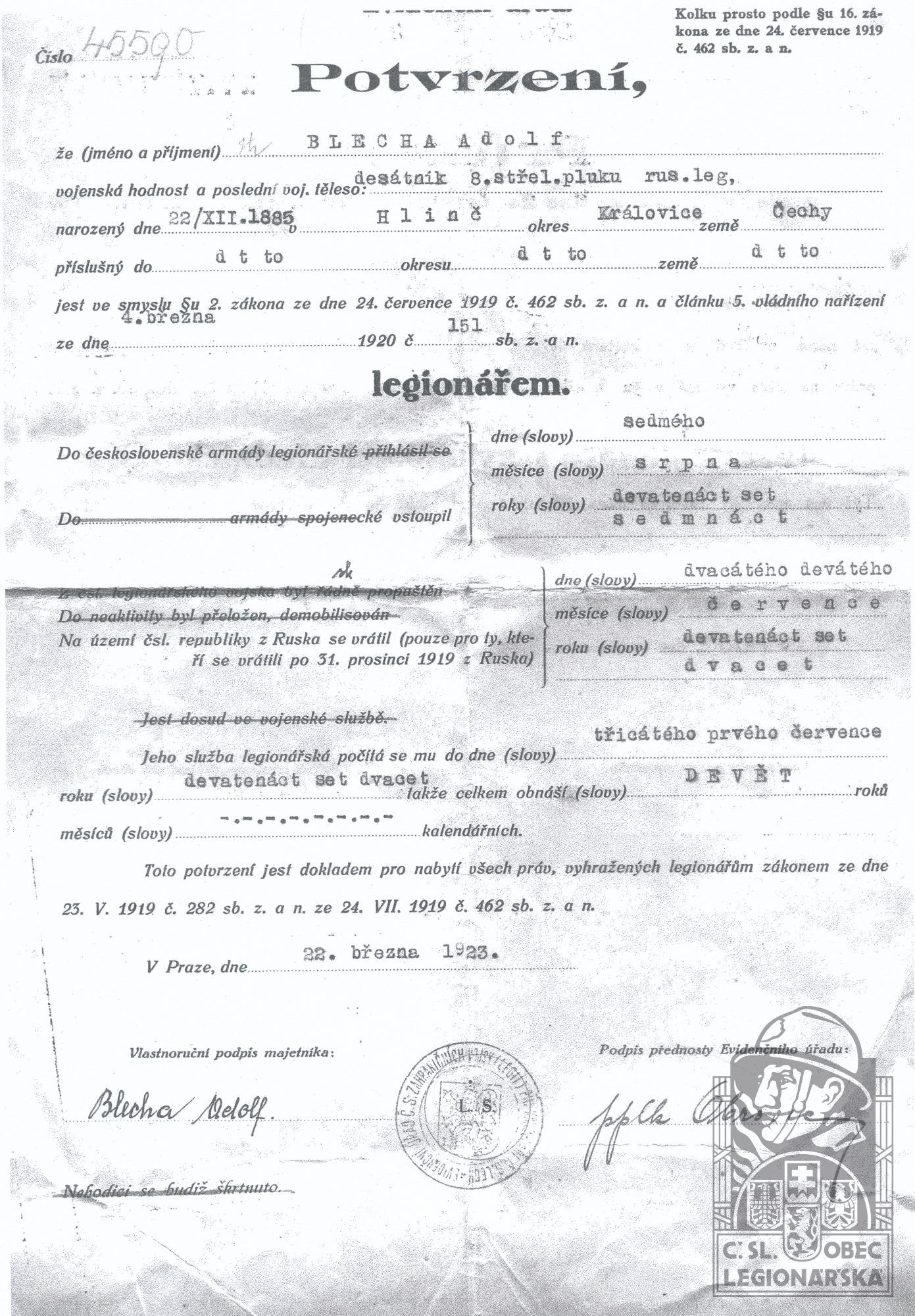 Konec v legiích:25.9.1920 ( Demobilizován )