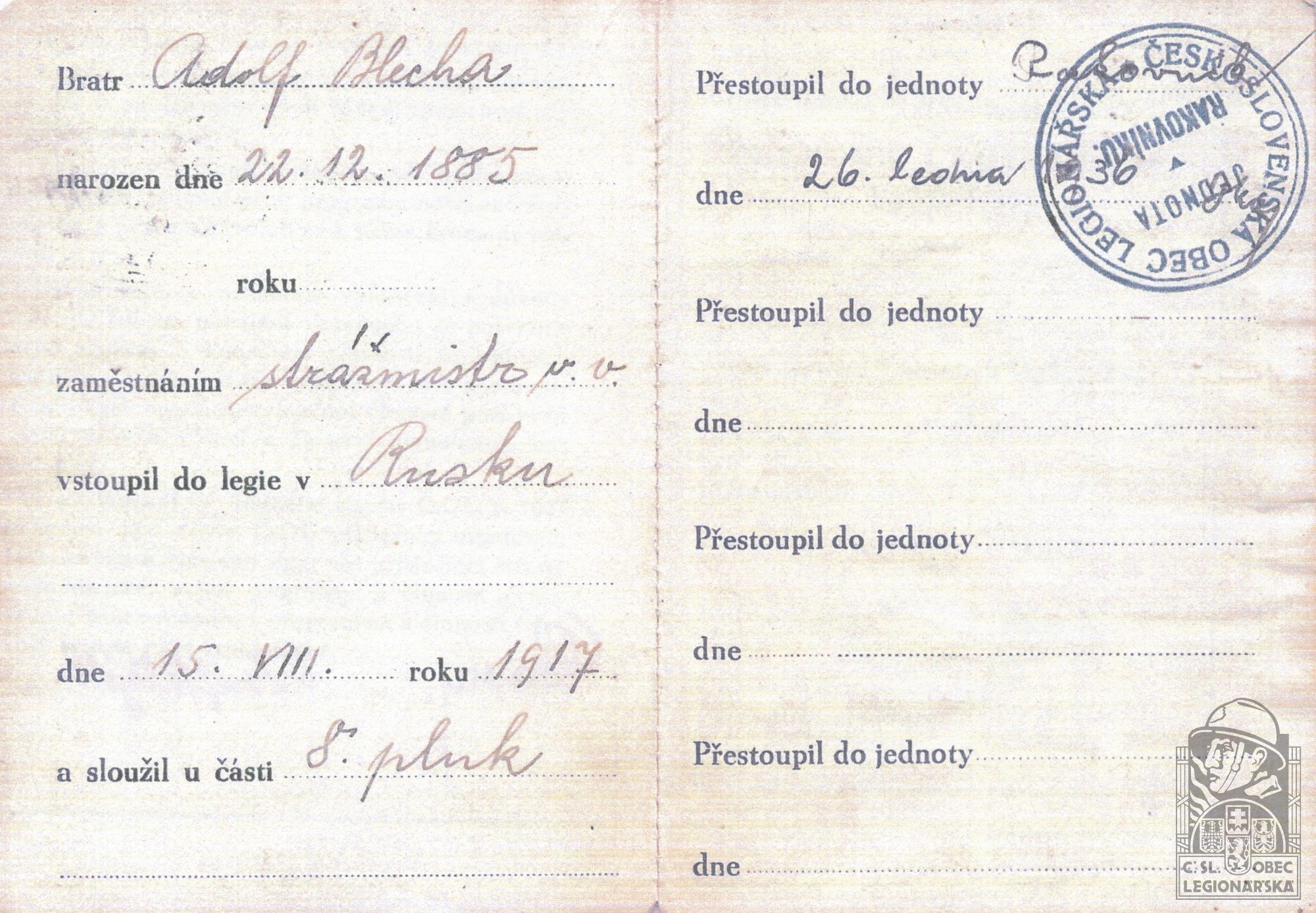 Zdroj informací: legionářský poslužný spis osobní karta legionáře