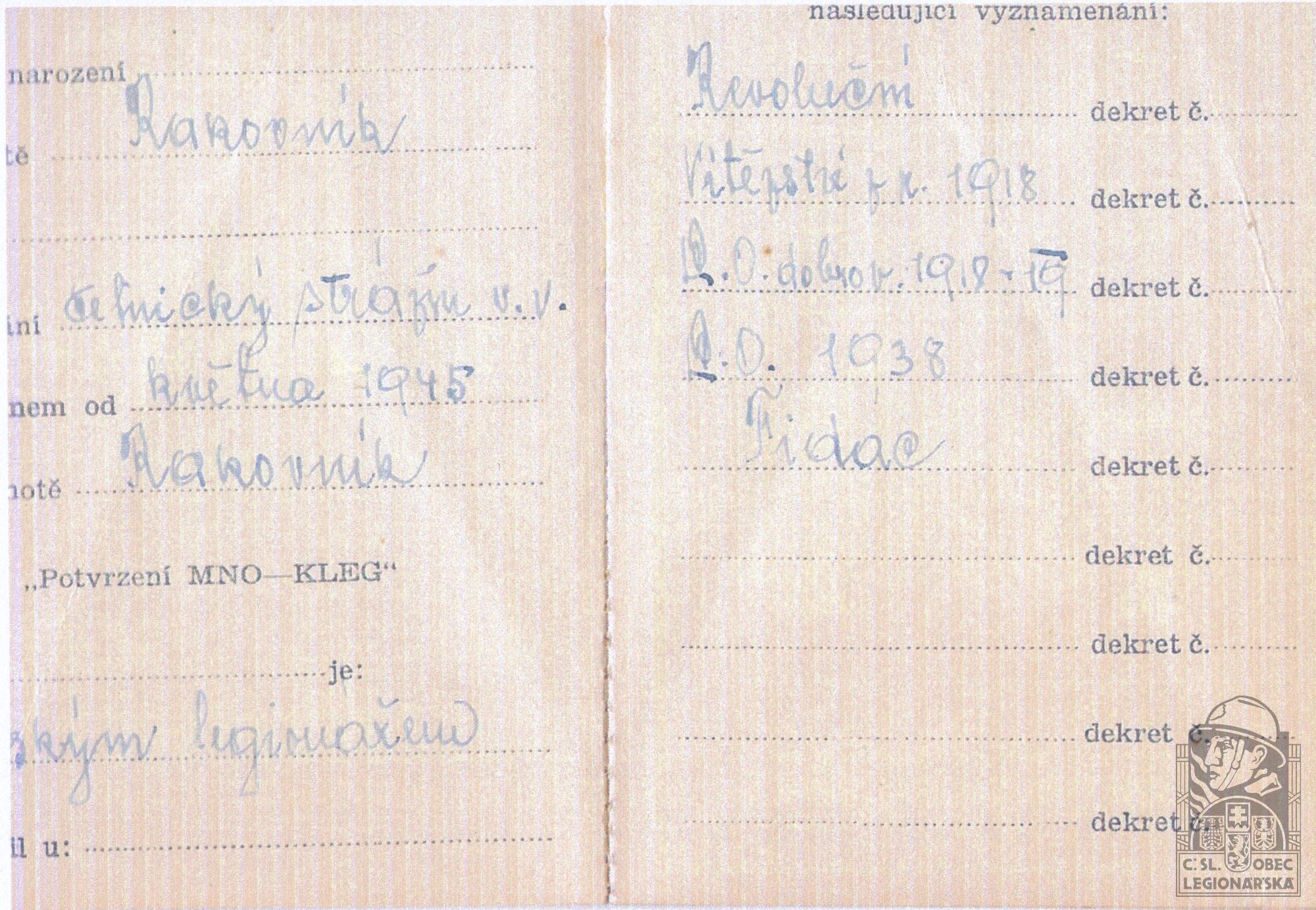 dokumenty spojené s osobou legionáře
