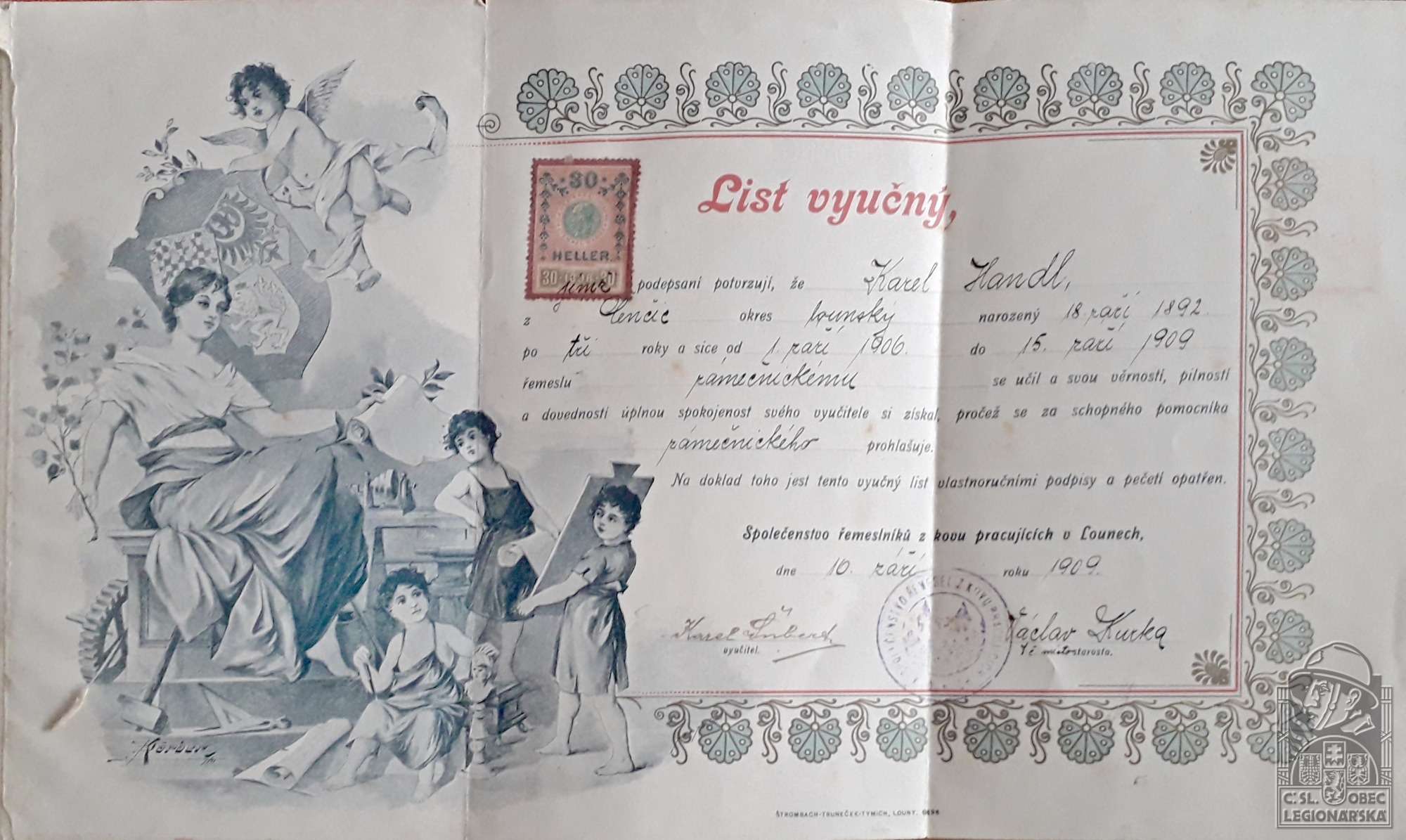 Životopis:Karel Handl (Hándl) se narodil 11.9.1892 v Oseku u Duchcova. V rakousko-uherské armádě sloužil u 29. zeměbraneckého pěšího pluku. V jeho řadách byl jako vojín zajat na řece Strypu 30.8.1915. Do legie se přihlásil 26.6.1917 v Bobrujsku a o tři dny později nastoupil jako vojín k 4. střeleckému pluku. S Janou Zápolskou , nar. 21.8.1899 v Kotelnu u Kyjeva, se mu narodila první dcera v listopadu 1917 v Kyjevě. Do Československa mohla za mužem odplout teprve v roce 1921. Vychovali spolu ještě další dvě dcery a syna. Karel Handl později sloužil u autoparku a v jeho řadách se vrátil i do vlasti v hodnosti desátníka či četaře. Byl za statečnost v boji vyznamenán čs. Válečným křížem a byl dekorován 6 dalšími vyznamenáními.