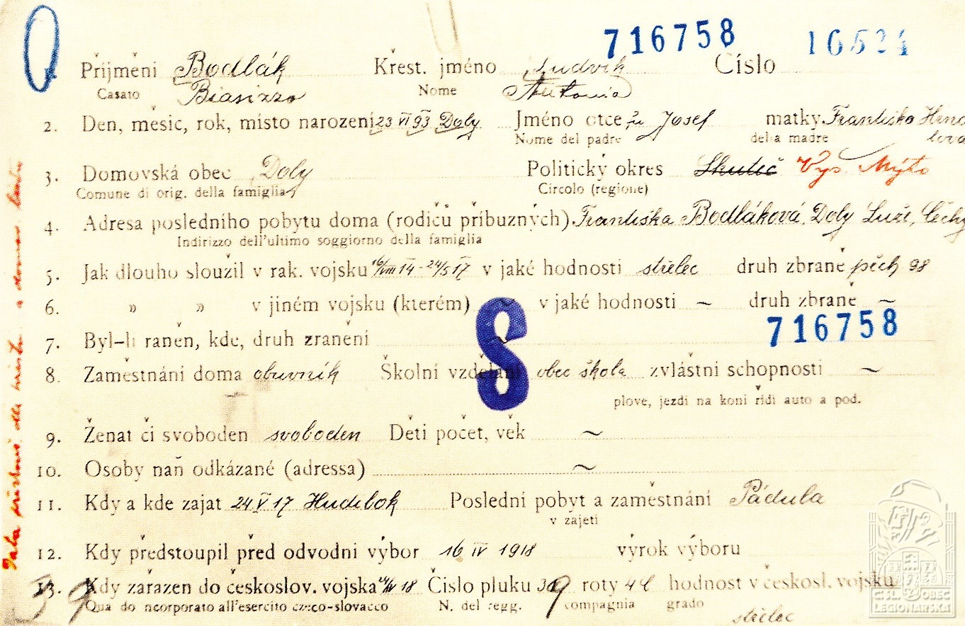 Jednotka v době zařazení:31.p.pl. ( Čs. legie v Itálii )