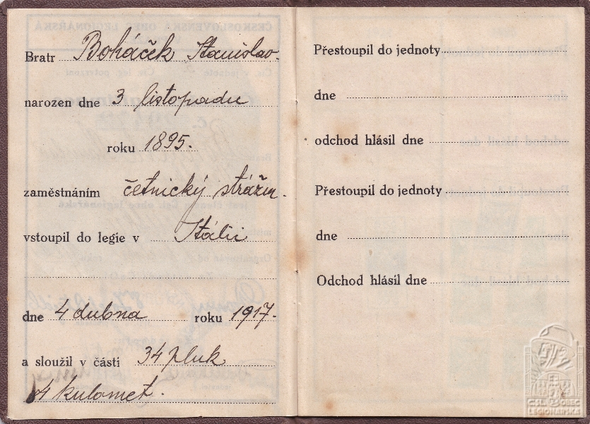Zdroj informací: legionářský poslužný spis osobní karta legionáře